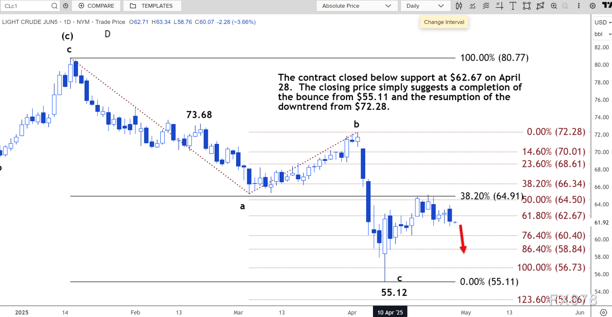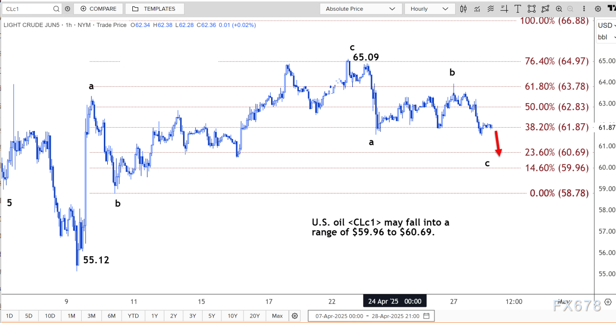 周二(4月29日)亚市,国际油价震荡微跌,美原油目前交投于61.70美元/桶附近,跌幅约0.55%。路透技术分析师指出,根据其波形和预测分析,美原油可能跌至每桶 59.96 美元至 60.69 美元的区间。 ![]() 市场再次短暂跌破61.87美元的支撑位。极有可能突破该阻力位,跌至59.96-60.69美元区间。 阻力位在62.83美元,如果突破该阻力位可能推动其上涨至63.78美元至64.97美元区间。 ![]() 收盘价仅仅表明从 55.11 美元的反弹已经完成,并且从 72.28 美元开始的下行趋势已经恢复。 北京时间11:00,美原油现报61.70美元/桶。 ![]() |