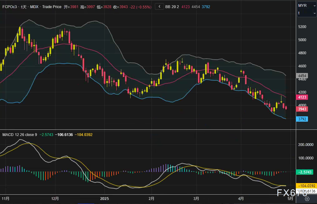 周二 4月29日 马来西亚棕榈油期货 FCPOc3 连续第二日收跌 7月合约收盘报3940林吉特 吨 跌幅0 63 林吉特走强 兑美元升值0 8 及竞争油脂疲软共同施压盘面 技术指标显示短期下行压力未消——布林带 20 2 中轨位 ...