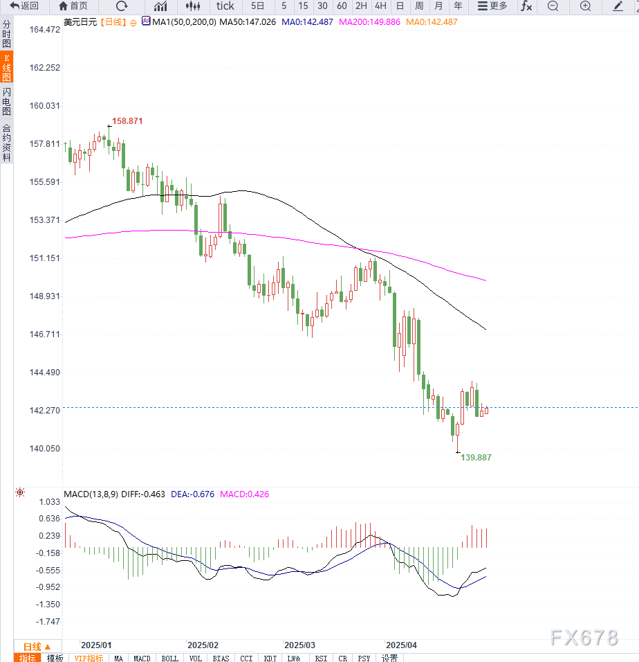 美元兑日元继续盘整,主要受到风险情绪改善与日本经济数据疲软的影响。特朗普宣布给予美国车企更多关税灵活性,并称部分加拿大和墨西哥产零部件将豁免关税,这推动市场风险偏好上升,抑制了避险资金流入日元。 ![]() “日本经济数据令人失望,但央行加息预期限制了日元下行空间。”市场分析师指出。 美元兑日元自本周初在144.00关口遇阻后展开回调,日线图上,价格未能有效突破144.00一线,技术上形成短期顶部信号。MACD死叉持续扩大,RSI位于中轴下方,暗示价格仍处于修正阶段。 ![]() 反之,若上破142.65,则短线可能出现空头回补,测试143.40阻力区域,进一步突破后才有望重新挑战144.00关口。 ![]() |