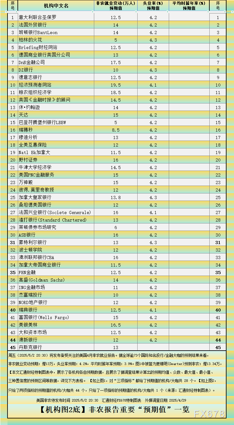 周五 2025 5 220 30 将发布备受关注的美国4月非农就业报告 据全球73个国际知名投行 金融大咖的预测结果来看 非农就业变动预期 增13万 失业率预期 4 2 平均时薪年率预期 3 9 但值得注意的是 图1中被誉为更精明 ...