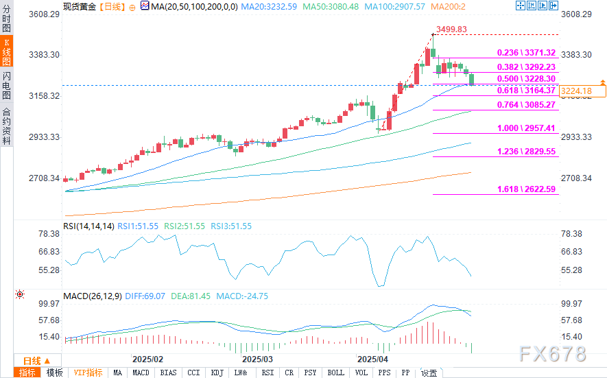 周四(5月1日)欧盘时段,假期交投清淡,黄金价格盘中报3225.26美元/盎司,下跌近2%,触及两周以来的最低水平。贸易紧张局势缓和带来的新的风险偏好情绪,进一步削弱了黄金作为避险资产的吸引力。 ![]() ![]() 新的空头力量突破了下一个强劲支撑位3230美元区间(2959美元至3500美元上涨波段的50%回撤位),这加剧了近期的负面前景。 日线技术指标显示,14日动量指标急剧下降,正接近中心线,同时日线转换线转向下方,这为市场走势提供了支撑。 4月的月K线图带有极长的上影线,这也有助于形成反转信号。 若有效跌破3230美元区间,将进一步削弱近期的市场结构,并使下方目标价位3200美元(心理关口)和3164美元(斐波那契61.8%回撤位)面临风险。 此前的低点3260美元成为初步阻力位,而3300美元现在则成为坚实的阻力位,这应该会限制潜在的上涨行情,并表明市场正在为更深层次的回调做准备。 阻力位:3260美元;3292美元;3300美元;3328美元 支撑位:3221美元;3200美元;3164美元;3100美元 北京时间19:28,现货黄金报3224.13美元/盎司,跌幅1.95%。 ![]() |