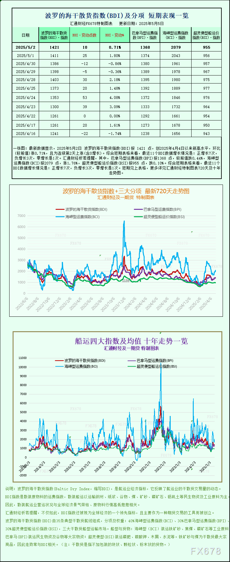 最新数据显示 2025年5月2日波罗的海干散货指数 BDI 报1421点 创2025年4月4日以来新高水平 环比 较前值 涨0 71 且为连续第2天上涨 含0增长 综合短期表格来看 最近11个BDI数据增长情况是 正增长7次 负增长 ...