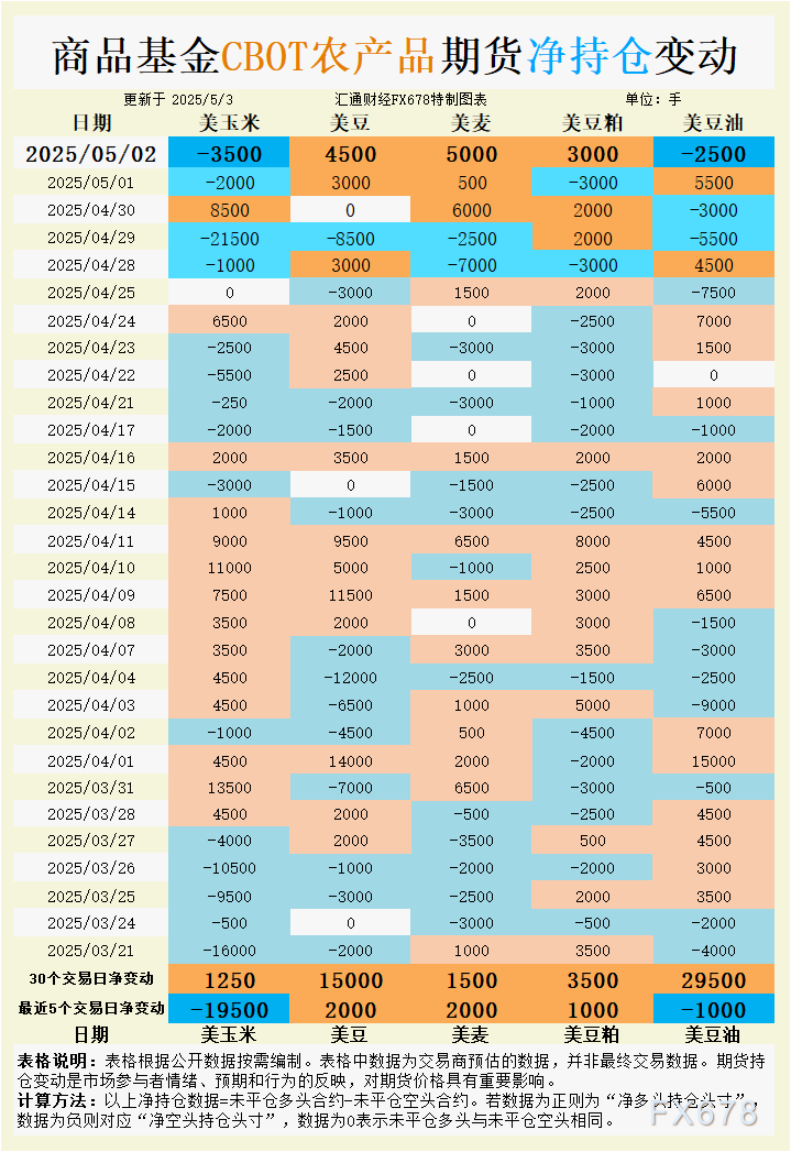 芝加哥期货交易所 CBOT 谷物期货市场隔夜延续震荡分化格局 市场情绪受基本面 持仓变动及国际交易动态交织影响 最新数据显示 商品基金在周五 5月2日 对CBOT小麦 大豆和豆粕期货转为净买入 玉米和豆油则被净卖出 反映 ...