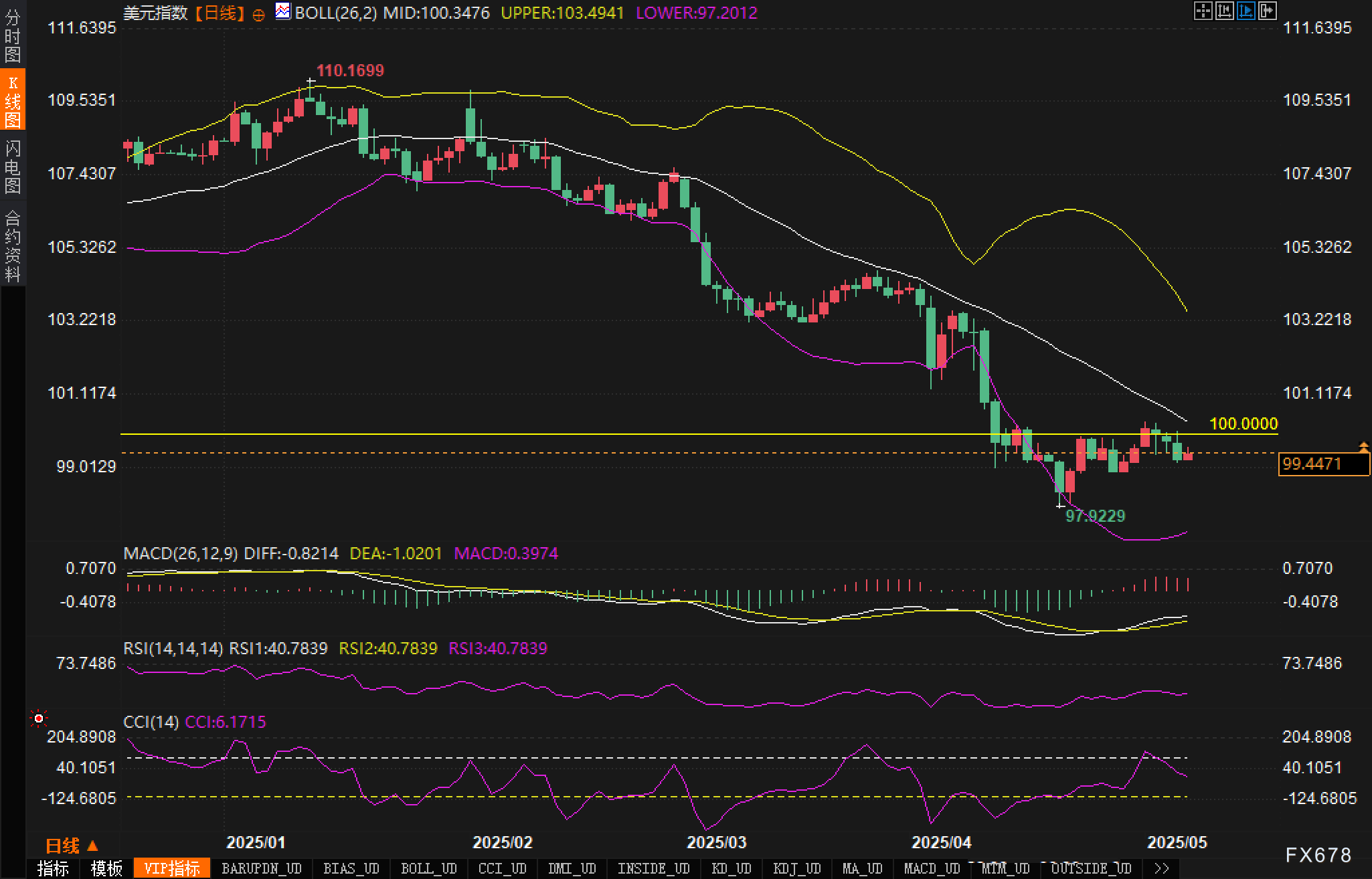 周三(5月7日),美元指数北美时段在99.40附近窄幅整理,此前曾创下近五日新低。市场目光聚焦于本周末重要经济体在瑞士举行的贸易对话,以及美联储晚间的利率决议。虽然特朗普施压降息,但市场几乎完全预期美联储将维持现有利率水平不变。 ![]() 美元对G10货币大部分保持稳定,并试图从近期对日元、瑞典克朗、澳元和纽元的疲软中恢复。 与此同时,美英之间的谈判据报道已经加速,英国官员已抵达华盛顿展开对话。特朗普上周末宣布可能本周签署一项贸易协议,《金融时报》证实了这种可能性,特别是与英国相关的部分。 美国10年期国债收益率在4.30%略上方窄幅整理,2年期收益率则在3.80%略上方,两者都在等待美联储政策决议和新闻发布会。市场广泛预期美联储将维持利率不变,且没有新的经济预测,因此风险主要取决于鲍威尔在新闻发布会上对增长和通胀前景的表述,特别是在贸易紧张局势和过去一个月左右发生的建设性进展背景下。市场仍然预期年底前美联储会有几次降息,如果鲍威尔倾向于更乐观的展望,可能会引发市场调整。 技术面分析师解读: 美元指数日线图显示,价格目前在99.40附近整理,明显低于100.00的整数阻力位。指数自今年初以来呈现明显的下行趋势,从110区域一路下滑至目前的99区域。日线图上可见,价格正在测试上升通道的下轨支撑位,并且已经在4月下旬触及了97.9229的阶段性低点。 ![]() 布林带指标显示中轨位于100.3476,上轨位于103.4941,下轨位于97.2012,当前价格接近下轨,显示空头压力较大。值得注意的是,价格目前在99-100区间内整理,这一区间成为短期内的关键争夺区域,若无法站稳100整数关口,后市或继续承压。 市场情绪观察 当前市场情绪呈现谨慎乐观状态。一方面,全球贸易对话的预期提振了风险偏好,权益市场小幅上涨;另一方面,美联储决议前的不确定性又使交易员保持警惕。 美国10年期国债收益率在4.33%附近稳定,表明市场平静地等待美联储主席鲍威尔的言论。从CME FedWatch工具来看,市场对美联储6月降息的预期概率为28.3%,而对7月降息的预期已经达到74.2%,显示市场整体维持降息预期。 后市展望 多头展望 如果美联储主席鲍威尔在新闻发布会上表现出温和立场,同时本周末全球贸易对话取得积极进展,美元指数可能会在短期内挑战100整数关口。技术面上,MACD指标红柱扩大是一个积极信号,CCI指标从超卖区域回升也提供了一定支撑。近期的横盘整理区域可能成为筑底形态,为后续反弹奠定基础。主要支撑位在98.00附近,而上方阻力在100.00和100.35(布林带中轨)。 空头展望 然而,从中长期来看,美元指数依然处于下降通道中,MACD和RSI指标均未出现实质性转向信号。如果贸易对话未能取得实质性进展,美元指数可能会继续承压,测试97.00关口。此外,美国经济数据如若出现疲软,市场对降息的预期将进一步强化,这将继续削弱美元的吸引力。下行风险包括美联储更加鸽派的表态和地缘政治紧张局势的意外恶化。 注:本文基本面内容据路孚特报道展开。 ![]() |