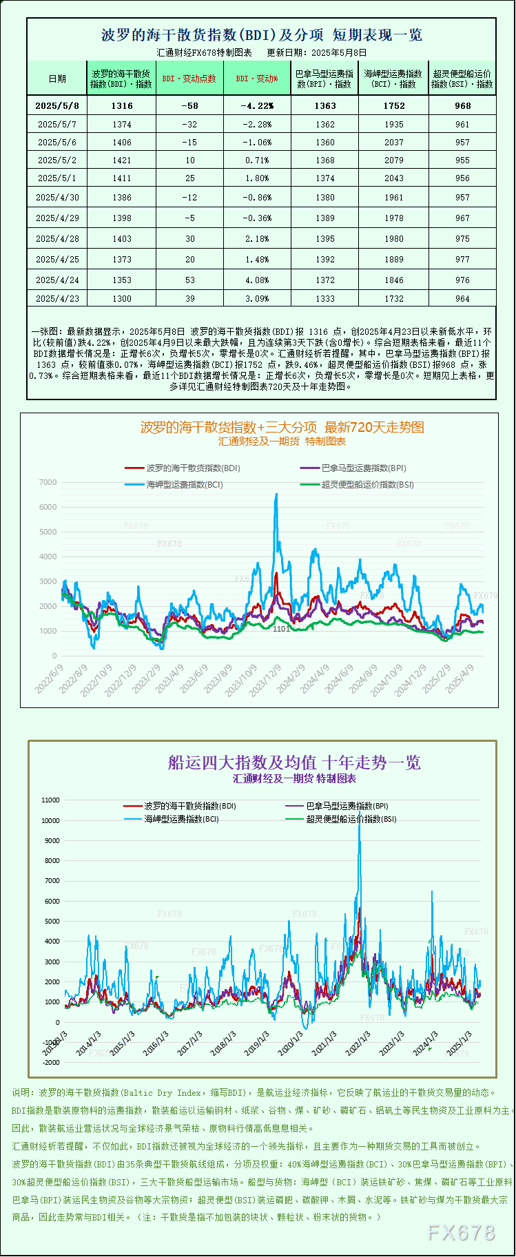 最新数据显示 2025年5月8日波罗的海干散货指数 BDI 报1316点 创2025年4月23日以来新低水平 环比 较前值 跌4 22 创2025年4月9日以来最大跌幅 且为连续第3天下跌 含0增长 综合短期表格来看 最近11个BD ...