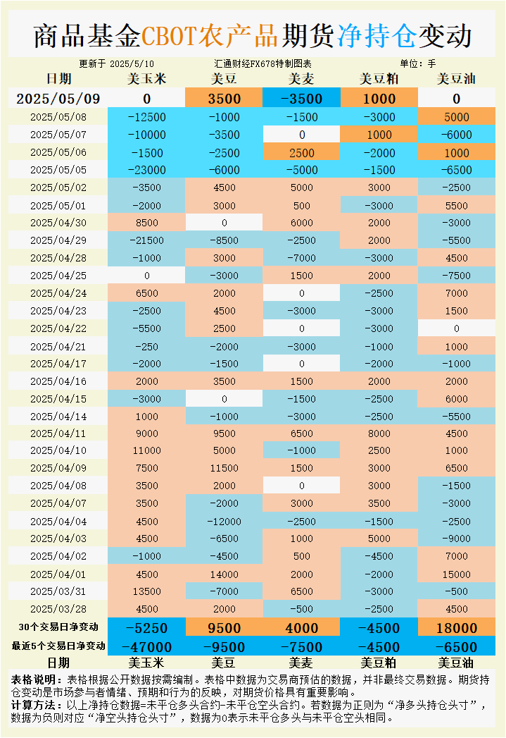 周六(5月10日),CBOT谷物期货市场在复杂的基本面和情绪驱动下呈现分化走势。市场关注焦点集中在即将发布的USDA供需报告以及周末的美中贸易谈判的进展。CBOT七月玉米期货收涨2.25美分,报4.49-3/4美元/蒲式耳;七月大豆期货上涨6.75美分,收于10.51-3/4美元/蒲式耳;七月豆粕期货下跌6美元,收于294.10美元/短吨;七月小麦期货下跌7.25美分,收于5.17-1/2美元/蒲式耳。近期出口销售数据为玉米和大豆提供支撑,但小麦因美国国内天气改善和出口需求疲软承压。投机者持仓变动进一步揭示市场情绪,结合基差和国际交易动态,谷物期货短期走势仍将受供需预期和外部不确定性主导。 ![]() 持仓变动:截至5月9日,商品基金在CBOT玉米期货持仓未见明显增减,当日净持仓变动为0手,但近5个交易日净空头寸增加47000手,近30个交易日净空头寸增加5250手。CFTC数据显示,截至5月6日,投机者净空头寸增至104151手,较前一周增加50794手。 基本面分析:美国农业部确认对墨西哥销售288000吨玉米,其中192900吨为2025/26年度交货,显示出口需求稳健。然而,巴西即将进入玉米丰收期,全球买家可能转向更便宜的南美供应,对美玉米构成竞争压力。美国中西部现货市场基差表现分化,内布拉斯加布莱尔地区基差上涨2美分,而爱荷华州达文波特河港基差下跌3美分,反映区域性供需差异。市场预期USDA周一的供需报告可能上调美国玉米库存预测,叠加种植条件理想,短期价格上行空间受限。 走势预测:投机者大幅加码空头寸显示对价格下行的预期增强,反映供应过剩担忧。七月玉米期货在4.50美元/蒲式耳附近挣扎,短期可能测试4.40美元/蒲式耳支撑位。出口销售为价格提供一定底部支撑,但若报告确认库存增加,空头情绪可能进一步推低价格。 大豆:多头情绪回暖,贸易谈判提振市场 持仓变动:5月9日,商品基金净买入3500手大豆期货,近5个交易日净空头寸增加9500手,但近30个交易日净多头寸增加9500手。CFTC数据显示,截至5月6日,投机者转为净空头寸9277手,较前一周减少多头寸15045手。 基本面分析:美国农业部确认对巴基斯坦销售120000吨2025/26年度大豆,连续两日出口交易提振市场信心。日内瓦美中贸易谈判为市场注入乐观情绪,因中国作为全球最大大豆进口国,其采购动向对价格影响显著。然而,美国中西部现货基差走弱,伊利诺伊州迪凯特加工厂和达文波特河港基差均下跌4美分,显示现货需求疲软。巴西大豆进入尾声,美国新作种植进度顺利,USDA报告可能下调2024/25年度出口预期。 走势预测:投机者短期空头情绪占优,但日内多头增持和贸易谈判乐观预期推动七月大豆期货突破10.50美元/蒲式耳。短期价格可能在10.40-10.60美元/蒲式耳区间震荡,若谈判取得进展或报告显示库存收紧,价格有望测试10.70美元/蒲式耳阻力位。 豆粕:需求疲软拖累价格,空头基调延续 持仓变动:5月9日,商品基金净买入1000手豆粕期货,但近5个交易日净空头寸增加4500手,近30个交易日净空头寸增加4500手。 基本面分析:韩国饲料协会采购60000吨豆粕,来源可选自南美、美国或中国,成交价约349.99美元/吨(含附加费用),显示全球豆粕需求稳定但竞争激烈。美国国内豆粕现货市场基差走弱,密苏里州圣约瑟夫卡车终端基差下跌,反映需求低迷。七月豆粕期货收跌6美元,至294.10美元/短吨,显示市场对供应充足的预期。USDA报告可能上调美国豆粕库存,因加工利润承压和出口竞争加剧。 走势预测:投机者空头情绪延续,叠加现货需求疲软,七月豆粕期货可能进一步下探290美元/短吨支撑位。短期内缺乏强力利多因素,除非出口需求意外激增,价格上行空间有限,需关注USDA报告对库存的指引。 豆油:持仓平稳,市场缺乏方向性驱动 持仓变动:5月9日,商品基金在豆油期货持仓未见变动,当日净持仓为0手,近5个交易日净空头寸增加6500手,但近30个交易日净多头寸增加18000手。 基本面分析:豆油市场基本面相对平静,缺乏显著驱动因素。美国中西部现货市场基差未见明显波动,反映供需平衡。全球食用油市场竞争加剧,南美豆油和棕榈油价格优势限制美豆油出口。七月大豆期货上涨带动豆油价格小幅走高,但豆粕疲软拖累整体油粕比价。USDA报告可能维持豆油库存预测不变,因国内消费稳定但出口前景不明。 走势预测:投机者长期多头基调与短期空头调整并存,七月豆油期货可能在当前价位附近横盘整理,波动区间预计在42-44美分/磅。USDA报告若显示库存意外收紧,价格可能小幅上扬,但整体趋势仍需更多基本面催化。 小麦:空头主导市场,天气改善加剧压力 持仓变动:5月9日,商品基金净卖出3500手小麦期货,近5个交易日净空头寸增加7500手,近30个交易日净多头寸增加4000手。CFTC数据显示,截至5月6日,投机者净空头寸减少12426手,至104160手。 基本面分析:美国平原地区硬红冬小麦现货基差稳中偏强,俄克拉荷马州伊尼德地区基差上涨25美分,显示局部现货需求支撑。然而,七月小麦期货跌至5.17-1/2美元/蒲式耳,创合约新低,因美国中南部平原降雨改善晚期冬小麦生长条件。堪萨斯州小麦作物巡查即将来袭,市场预期产量前景乐观。俄乌局势和黑海地区降雨进一步压低全球小麦价格,出口需求疲软拖累美麦竞争力。 走势预测:投机者持续加码空头寸,叠加天气利好和出口低迷,七月小麦期货可能进一步下探5.10美元/蒲式耳支撑位。USDA报告若确认美国小麦产量上调,空头压力将加剧,短期反弹空间有限。 