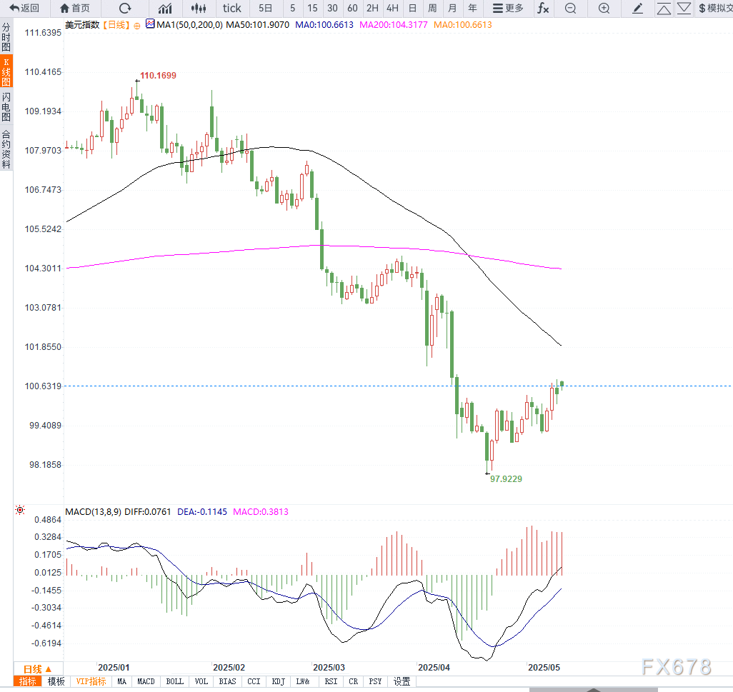 在亚洲大国与美国高层官员于日内瓦达成削减美国贸易赤字的初步协议后,投资者对贸易的担忧情绪明显缓和。美元在周一亚洲交易时段反弹,美元指数上涨0.1%,逼近一个月高位,尽管自4月初美国宣布新一轮关税以来,该指数仍下跌了3.5%。 ![]() “本周澳洲的就业数据也值得关注,但我认为贸易谈判仍将是决定市场走势的主导因素。”——Michael McCarthy补充道 此外,印度与巴基斯坦在经历四天冲突后宣布停火,乌克兰总统表示将于周四在土耳其与俄罗斯总统会面,这些都令全球市场对地缘政治风险的担忧降温,为美元和风险资产提供支撑。 从日线图来看,美元指数自4月初触及年内高位后回落,并在上周于99.00附近获得支撑展开反弹,目前逼近101.00区域的关键阻力位。K线形态上形成小型双底结构,MACD出现低位金叉,短线多头动能有所增强。 5日与10日均线拐头向上,并有望在短期内上穿20日均线,若有效突破101.00,将打开向上测试101.50的空间。但值得注意的是,101.50至102区域为前期成交密集区,存在较强抛压,叠加本周通胀数据风险,短线不排除再次震荡回落的可能。 整体来看,短线偏强,中期仍需基本面配合突破关键阻力。 ![]() 美元当前走势的回暖更多体现出短期市场对贸易局势缓和的乐观预期,但中期仍需观察美国通胀与消费数据是否支持美联储继续加息路径。 美元技术上正在测试关键阻力区域,若本周数据表现强劲,或能支撑美指进一步上行。 ![]() |