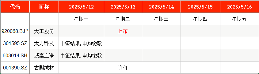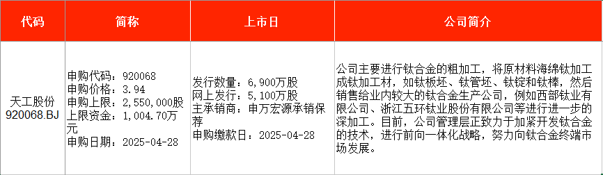 今年以来发行价最低的新股将于本周二上市。 澎湃新闻根据Wind及公开信息梳理统计,本周(5月12日至5月16日)没有A股新股申购安排。 江苏天工科技股份有限公司(下称“天工股份”,920068)将于本周二(5月13日)上市。数据显示,发行价为3.94元/股的天工股份,是今年以来发行价最低的新股。 此外,值得一提的是,A股龙头宁德时代新能源科技股份有限公司、江苏恒瑞医药股份有限公司等上周已通过港交所上市聆讯。 ![]() 一、本周新股申购 本周(5月12日至5月16日)暂时没有A股新股申购安排。 上周(5月6日至5月9日),有3只A股新股申购。分别为江苏汉邦科技股份有限公司(下称“汉邦科技”,688755)、广东太力科技集团股份有限公司(下称“太力科技”,301595)、山东威高血液净化制品股份有限公司(下称“威高血净”603014)。 二、本周新股上市 根据安排,江苏天工科技股份有限公司(下称“天工股份”,920068)将于本周二(5月13日)上市。值得一提的是,数据显示,发行价为3.94元/股的天工股份,是今年以来发行价最低的新股。 ![]() 据华金证券研报,天工股份与苹果供应链企业常州索罗曼深度合作;报告期间,受益于钛材料在消费电子领域形成广泛应用,实现了业绩的大幅增长。2023年9月苹果公司发布的iPhone15Pro系列首次采用了钛金属中框、取代了传统的不锈钢材质,成为该系列产品的一大亮点;至此,消费电子用钛材市场开始进入快速发展阶段,荣耀、小米、三星等主流 3C 厂商发布的新机中也均开始不同程度地导入钛合金材料,将钛金属运用于机身边框等等,钛材料的使用已成为行业潮流。 公司前瞻性地布局消费电子领域用钛材的研究,并与常州索罗曼达成合作,据公开资料显示,2022年常州索罗曼被纳入苹果供应链;相应的,公司于2022年11月开始向常州索罗曼批量供应消费电子用钛合金线材,常州索罗曼也自2022年起成为公司第一大客户。 目前,钛材在折叠屏手机、智能穿戴设备等领域的应用不断增加,消费电子用钛材料市场前景良好,或助力公司经营稳定向好。公司正积极研发生产航空航天、医疗等其他钛材应用领域相关产品;其中,航空航天用紧固件等产品已处于小批量试生产阶段。 根据业务的相似性,华金证券选取西部超导、宝钛股份、金天钛业为天工股份的可比上市公司。从上述可比公司来看,2024年度可比公司的平均收入为40.26亿元,平均 PE-TTM(算数平均)为40.12X,平均销售毛利率为31.03%;相较而言,公司营收规模及毛利率未及同业平均。 三、本周A股IPO上会 发审委审核方面,本周北京证券交易所(下称“北交所”)将继续开审。 官网资料显示,北京证券交易所上市委员会定于2025年5月16日上午9时召开2025年第6次审议会议,审议发行人江苏酉立智能装备股份有限公司(下称“酉立智能”)的首发事项。 ![]() 酉立智能自设立以来深耕光伏支架领域,聚焦光伏支架核心零部件的研发、生产和销售。公司主营产品包括光伏支架主体支撑扭矩管(TTU)、光伏支架轴承组件(BHA)、光伏组件安装结构件(URA)以及檩条(RAIL)等光伏支架核心零部件产品。公司主营产品经组装后,可形成光伏电站之“骨骼”——光伏支架,包括跟踪支架及固定支架,其中跟踪支架与配套的电控设计、驱动设计共同构成光伏跟踪支架系统。 四、港股最新动态 Wind数据显示,绿茶集团(06831.HK)在本周一至周二(5月12日-5月13日)继续申购。 ![]() 上周,港股共有4家企业递交招股书,希迪智驾科技股份有限公司、英矽智能、Mirxes Holding Company Limited、中企云链股份有限公司等公司均为更新招股书。 同时,厦门吉宏科技股份有限公司、宁德时代新能源科技股份有限公司、江苏恒瑞医药股份有限公司等3家公司通过港交所聆讯。 此外,上海富友支付服务股份有限公司的申请失效。 ![]() 五、投融资大事记 1、5月6日,智新浩正(上海)医药科技有限公司(智新浩正)宣布完成近2亿元融资,本轮由上海科创集团(上海国投公司下属)、大零号湾策源基金两支国资投资主体联合领投的A轮亿元融资,以及由老股东利欧股份领投、磐霖资本联合锦泰金泓基金增资的Pre-A+ 轮共同组成。本轮资金将重点推进国内首个异体通用型再生胰岛管线临床I/II期试验,加速拓展亚洲战略布局,开拓糖尿病和肝病治疗的新管线。 2、5月6日,心航路医学科技公司(心航路医学)宣布完成6亿元的B轮融资。本轮融资由美团龙珠基金和老股东礼来亚洲基金(LAV)联合领投,老股东龙磐投资继续超额加注。继2023年8月完成近两亿元的A轮融资后,心航路医学再次实现市场化超募融资。此次B轮融资将加速心航路医学核心电生理产品的研发和注册临床试验,并进一步巩固其在全球电生理领域的技术与产品优势。 3、5月6日,上海太洋科技有限公司(下称“太洋科技”)完成数亿元融资,投资方包括招商局资本、昆仑资本、浙江发展等,安徽省芯屏产业基金参与本轮融资。 4、5月6日,工业通用具身智能企业IndustrialNext宣布完成数千万美元A轮融资,由Khosla Ventures领投(OpenAI首轮机构投资者),老股东Y Combinator、沸点资本持续加注,告捷资本担任独家财务顾问。公司累计完成三轮投资,投资方包括了产业投资人联想、小米和财务投资人Khosla Ventures、奇绩创坛、沸点资本、Y Combinator在内的多元股东阵容。 5、5月8日,L4级自动驾驶公司白犀牛宣布完成2亿元B轮融资。本轮融资由顺丰集团领投,鑫源汽车及老股东线性