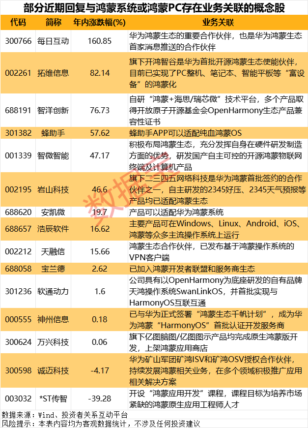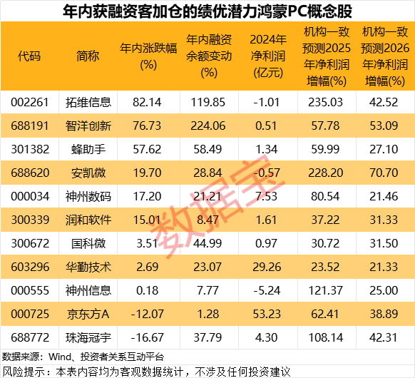 鸿蒙电脑产品将于5月19日正式发布。 按照Wind热门概念指数的表现来看,上周(5月6日至5月9日)A股市场表现领先的除航天、军工板块外,还有华为鸿蒙概念,其周涨幅达到6.29%,周度涨幅创下近12周最高水平。从具体概念股来看,上周涨幅居前的有科蓝软件、东方中科、九联科技,3只个股涨幅均超过10%。 消息面上,鸿蒙生态再迎重大进展。5月8日,华为在深圳举办鸿蒙电脑技术与生态沟通会,搭载鸿蒙操作系统的鸿蒙电脑(或称“鸿蒙PC”)重磅亮相,标志着国产操作系统在个人电脑领域实现重要突破。华为终端BG平板与PC产品线总裁朱懂东表示,鸿蒙电脑产品将于5月19日正式发布。 从鸿蒙手机、鸿蒙平板,再到鸿蒙PC,华为终端全面进入鸿蒙时代。西部证券研报指出,鸿蒙PC历经5年布局,集结上万名工程师、联合20多家研究所共同研发,积累超过2700项核心专利,从内核开始重构操作系统。目前,鸿蒙操作系统生态设备突破10亿台,鸿蒙开发者超过720万,代码超过1.1亿行。 西部证券表示,在鸿蒙PC应用生态上,当前已有300多个融合生态应用完成适配,预计到2025年底,这一数字将超过2000个。飞书、亿图脑图、中望CAD、美图秀秀等合作伙伴为鸿蒙PC打造创新特性,为鸿蒙PC生态发展注入动能。 鸿蒙PC搭载HarmonyOS 5操作系统,实现了AI能力与底层硬件、操作系统、软件应用的深度融合。鸿蒙PC支持手机、电脑、平板三设备键鼠共享,通过手眼同行、跨设备互通、应用接续、华为分享等创新功能,用户可告别多设备办公时的繁琐操作,实现手机、平板到电脑之间无缝衔接,极大地提升办公效率。 产业链迎来新发展机遇 在业内人士看来,华为全栈自研的“纯血鸿蒙”,正在悄悄改变全球操作系统的游戏规则。机构普遍对华为鸿蒙系统以及鸿蒙PC的未来前景表示看好。 据全球知名的科技行业市场研究机构Counterpoint Research数据统计,在中国市场,2024年第四季度,鸿蒙系统在中国手机操作系统中的市场份额达到19%,苹果iOS为17%,自2024年第一季度起,鸿蒙系统连续四个季度超越苹果iOS。 中航证券此前发布研报指出,鸿蒙PC是鸿蒙世界的一块重要拼图,从鸿蒙手机,到鸿蒙平板,再到鸿蒙PC,华为希望构建全场景互联的生态体验。未来,随着鸿蒙生态不断完善,技术创新持续突破,这场由原生鸿蒙掀起的“生态革命”或将重塑全球操作系统市场格局。 ![]() 数据来源:Counterpoint Research,中航证券研究所整理 多家公司披露与鸿蒙PC的合作关系 鸿蒙PC成功问世的背后,既有华为公司的前瞻布局,也离不开产业链上下游公司的深度参与。 鸿蒙PC产业链公司备受投资者关注。据证券时报·数据宝不完全统计,截至当前,已有岩山科技、芯海科技、宝兰德、拓维信息等公司在投资者关系互动平台披露与鸿蒙系统或鸿蒙PC的业务关联。 岩山科技近日回复投资者,公司旗下二三四五网络科技是华为鸿蒙首批签约的合作伙伴之一,自主研发的2345好压、2345天气预报等产品均已适配鸿蒙生态。 芯海科技4月初回复投资者,公司是鸿蒙的生态合作伙伴,2025年成功进入“鸿蒙智联推荐模组”厂商名单。公司注重技术创新和研发投入,在产品、商业布局等方面的突出亮点包括强大的模拟芯片和MCU设计能力。 宝兰德回复投资者称,公司已加入鸿蒙开发者联盟和服务商生态,主要产品下游应用客户包括电信、金融及党政等大型企、事业单位。 拓维信息回复投资者表示,旗下开鸿智谷是华为首批开源鸿蒙生态使能伙伴,同时也是开放原子开源基金会黄金捐赠人,目前已实现了PC整机、笔记本、智能平板等“富设备”的鸿蒙化,正在积极探索鸿蒙PC+行业相关的应用场景,为客户提供更多“鸿蒙+AI”的创新体验。 11只绩优潜力股出炉 融资客提前埋伏 根据公开信息整理发现,与鸿蒙PC业务关联度较高的个股不在少数,据数据宝初步统计,至少有40余只鸿蒙PC概念股。 从市场表现来看,截至5月9日,上述40余只概念股年内平均涨幅接近17%,每日互动、拓维信息、智洋创新等个股年内涨幅超过50%。其中,每日互动年内涨幅160.85%,公司是华为鸿蒙生态的重要合作伙伴,也是华为鸿蒙生态首家消息推送的合作单位。 另外,智洋创新年内涨幅76.73%,公司回复投资者表示,自研了“鸿蒙+海思/瑞芯微”技术平台,多个产品取得开放原子开源基金会OpenHarmony生态产品兼容性证书。 ![]() 从杠杆资金来看,截至5月8日,有19只概念股年内获融资客加仓,智洋创新、国子软件、拓维信息获融资客加仓超过100%,蜂助手获融资客加仓55%以上,国科微、珠海冠宇、浩辰软件、安凯微获融资客加仓超过25%。 国科微年内获融资客加仓近45%。公司是开源鸿蒙生态建设的参与者,截至2025年2月,公司累计5款产品通过鸿蒙认证,公司的智慧视觉系列产品均有配套鸿蒙解决方案,并已在客户端实现量产出货。 进一步分析发现,在上述19只获得融资客加仓的概念股中,11股符合以下两类业绩预期中的其中一种:其一,2024年实现盈利,且机构一致预测2025年、2026年净利润增幅有望持续超过20%;其二,2024年处于亏损状态,但机构一致预测2025年净利润增幅有望超过100%,2026年净利润增幅有望超20%。 值得关注的是,根据机构一致预测,神州信息、拓维信息、安凯微这3只个股2025年有望实现扭亏为盈。 神州信息年内获融资客加仓7.77%,公司2026年净利润增幅有望达到25%,公司已与华为正式签署“鸿蒙生态千帆计划”,成为华为鸿