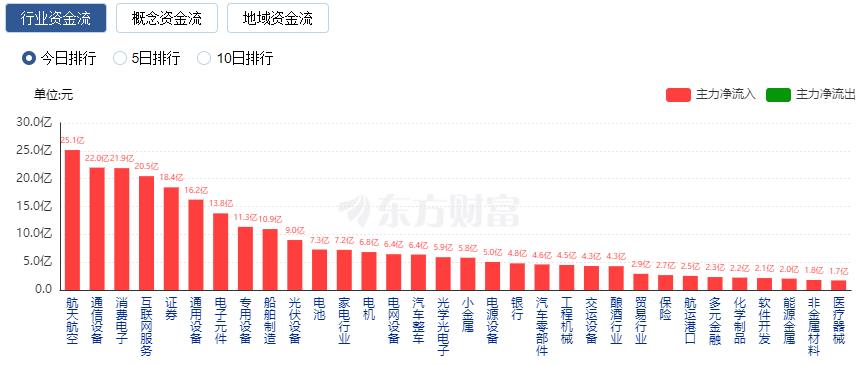 A股三大指数今日集体走强,截止收盘,沪指涨0.82%,收报3369.24点;深证成指涨1.72%,收报10301.16点;创业板指涨2.63%,收报2064.71点。沪深两市成交额达到13084亿,较上个交易日放量1164亿。 ![]() 行业板块多数收涨,两大军工板块航天航空与船舶制造大涨,电机、通信设备、消费电子、交运设备、电池、通信设备、电子元件板块涨幅居前,贵金属板块跌幅居前。 个股方面,上涨股票数量超过4100只,近百股涨停。军工股再度爆发,成飞集成等近30股涨停。机器人概念股震荡走强,拓斯达等涨停。消费电子概念股展开反弹,朝阳科技涨停。下跌方面,创新药概念股集体调整,百济神州跌近10%。 行业资金流向:25.14亿净流入航天航空 行业资金方面,截至收盘,航天航空、通信设备、消费电子等净流入排名靠前,其中航天航空净流入25.14亿。 ![]() 净流出方面,农牧饲渔、半导体、贵金属等净流出排名靠前,其中农牧饲渔净流出10.77亿元。 ![]() 今日要闻 何立峰:中美达成重要共识 会谈取得实质性进展 中美经贸高层会谈5月10日至11日在瑞士日内瓦举行。中美经贸中方牵头人、国务院副总理何立峰当地时间11日晚在出席中方代表团举行的新闻发布会时表示,此次中美经贸高层会谈坦诚、深入、具有建设性,达成重要共识,并取得实质性进展。双方一致同意建立中美经贸磋商机制。中美双方将尽快敲定相关细节,并将于5月12日发布会谈达成的联合声明。 特朗普:将签署行政令 药价将立即降低30%-80% 美国总统特朗普在其社交平台上表示,明天上午9点(北京时间周一21点)将在白宫签署一项美国历史上影响极为深远的行政命令,处方药和药品价格几乎会立即下降30%至80%。 军工行情被“点燃” 转折要来了? 近日,在大盘震荡回暖的背景下军工股表现却颇为亮眼,在过去的一周内,中证军工指数涨幅高达5.82%,更有多只个股走出连板行情,相关ETF也迎来资金的积极涌入。在主动权益基金对军工股配置达到历史底部之际,军工股的基本面也在今年一季度初现曙光,有机构指出,此前积压的需求有望快速释放,当前部分上游企业订单规模同环比有明显好转,且公布的订单数据也显示了下游已逐步进入高景气阶段。 超级利好!王兴兴释放重磅信号! 5月10日,第六届上海创新创业青年50人论坛上,宇树科技创始人王兴兴作为曾在上海创业的青年代表做主旨演讲。他在演讲中透露,受益于人形机器人市场热度和国家政策关注,目前包括宇树在内的人形机器人企业的发展都处于良好状态,“很多企业订单都爆掉了”。 机构观点 中信证券:风险偏好回暖,景气主题轮动 中信证券指出,资金风险偏好回升,围绕行业高景气度行业主题以及新概念主题进行展开,建议优先配置一季报表现出众的行业主题方向。随着一季报发布完毕,市场进入一个较为主题躁动的时期。从主题环境来看,综合流动性指标和市场风格特征,市场在一季报高景气的行业主题上持续布局,并对新的主题概念表现更强的偏好。从催化因素分析,建议重点关注国内的对内循环的稳楼市促消费刺激政策等。结合市场环境、催化因素以及综合量化指标研判,建议关注印巴冲突、消费电子、外骨骼机器人、脑机接口4个主题。 银河证券:A股市场“科技叙事”逻辑明晰,建议关注后续产业趋势的催化机会 中国银河证券研报指出,预计A股市场将维持区间震荡格局。配置上,建议关注三大方向:第一,业绩确定性相对较强、股息回报整体稳定的红利板块具备防御属性。第二,A股市场“科技叙事”逻辑明晰,建议关注后续产业趋势的催化机会。第三,关注大消费板块的配置机会,政策密集支持服务消费,“两新”政策扩围提质,带动行情修复。 申万宏源:A股重启结构牛 需求侧,特朗普关税影响基本面的关键变量,真正影响资产价格的因素应该是特朗普政策实际调整的情况,以及中美谈判情况。外需回落压力尚未显现,但后续仍有担忧。供给侧,本轮最终出现历史最大幅度供给出清的可见度已经很高。但仅看2025年供给增速方向回落,绝对水平依然偏高。供需格局改善2025年内难出现。预计未来两个季度,仍是基本面扰动信号较多的窗口,资本市场的预期调整“时间不足”,会抑制A股市场向上修复的空间。当前金融宽松集中落地且与稳定资本市场强关联,或许可能不足以实现中期基本面的全面改善和A股向上突破,但稳定并抬升震荡区间的效果还是不容忽视的。结构上,短期和长期,结构方向都是科技。一季报,景气方向集中在消费、医药和科技,短期科技相对性价比占优。长期,A股重启结构牛,需要科技重磅产业催化,强化市场共识,短期机器人微观结构占优,主题弹性好于国内AI,继续看好港股好于A股。 天风证券:市场后续主线的进一步思考 在特朗普2.0时期,我们判断政策驱动、地缘博弈格局驱动、产业驱动的逻辑可以构成长期逻辑。消费的长期逻辑为政策加码预期下的重估预期,基本面拐点或已经出现,宏观数据呈现诸多积极信号。配置思路:(1)财报拐点出现+政策支持力度与确定性大+纯内需板块,一是政策基调明确,政策补贴力度明显抬升,二是财报积极线索出现,可视为一段行情的前夕。根据政策补贴力度占营收比重,盈利增速和政策语调,服务业有望在二季度成为主线。(2)财报拐点出现+政策与产业逻辑通畅+排除基数效应&外需影响板块,这一类的本质是政策逻辑稍弱、产业逻辑不证伪下,财