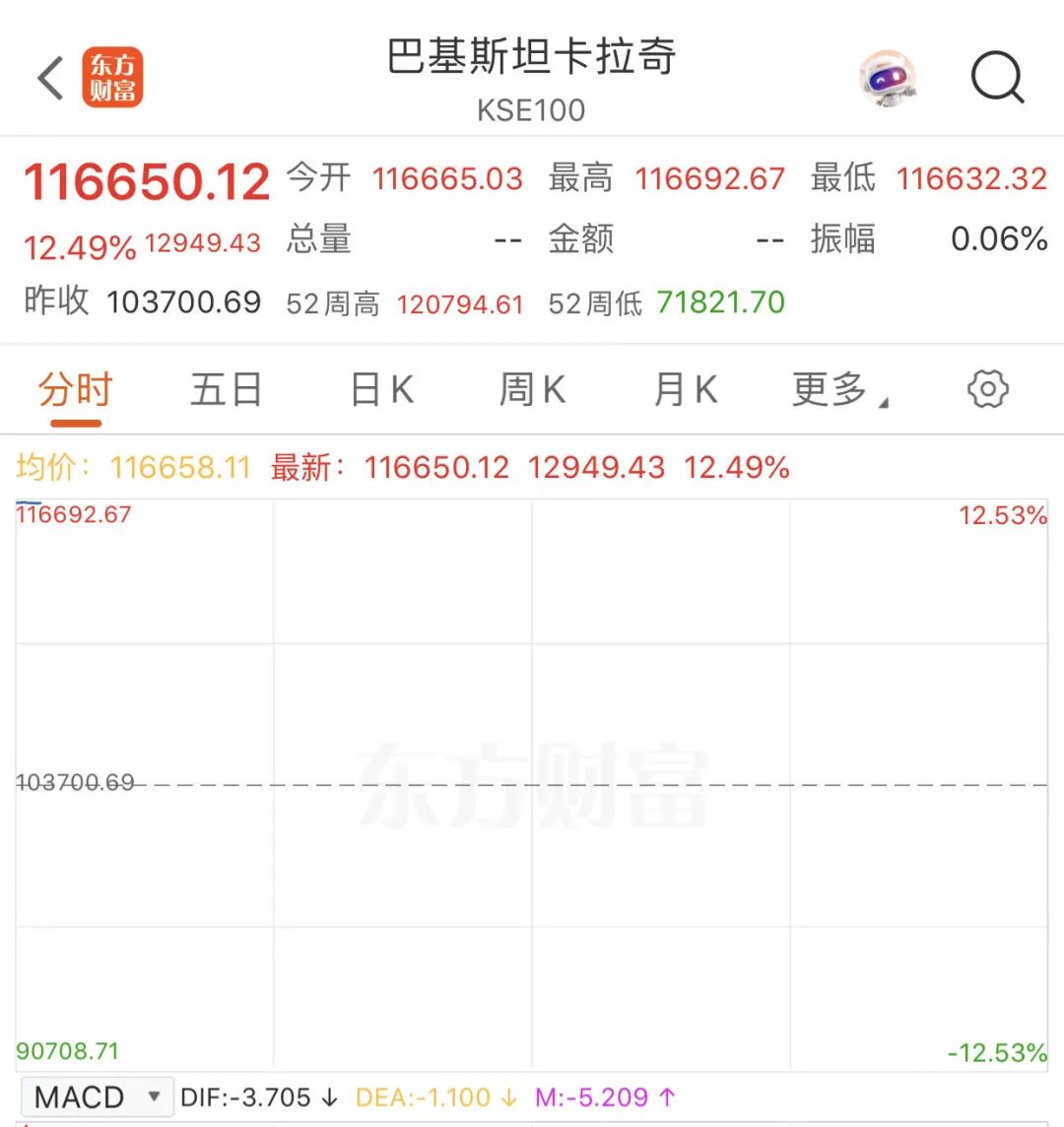 印巴全面停火,巴基斯坦股市暴涨。 当地时间5月12日,巴基斯坦股市暴涨,目前已暂停交易。暂停交易前,巴基斯坦卡拉奇KSE100指数涨超12%,上涨12949.43点,现报116650.12点;巴基斯坦KSE30指数涨超9%。 ...