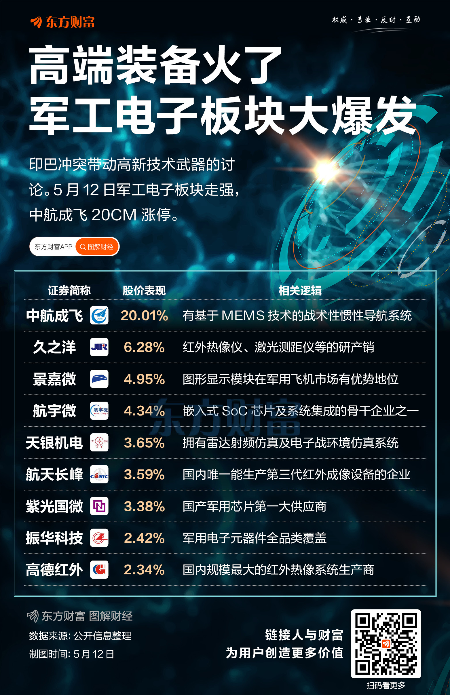 5月12日,军工板块继续走强,其中军工电子方向强势,中航成飞20CM涨停,久之洋、景嘉微也表现强势。 近日印巴冲突成了市场关注的焦点,其中印度的阵风战机被中式武器击落的消息更是引起热议。在上周军工板块 ...