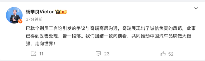 针对奇瑞高管在社媒拉踩吉利新车,浙江吉利控股集团高级副总裁杨学良5月12日下午在社交平台发文回应称,“已就个别员工言论引发的争议与奇瑞高层沟通,奇瑞展现出了诚信负责的风范,此事已得到妥善处理,告一段 ...