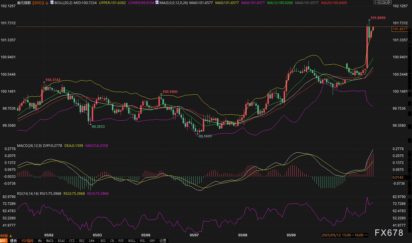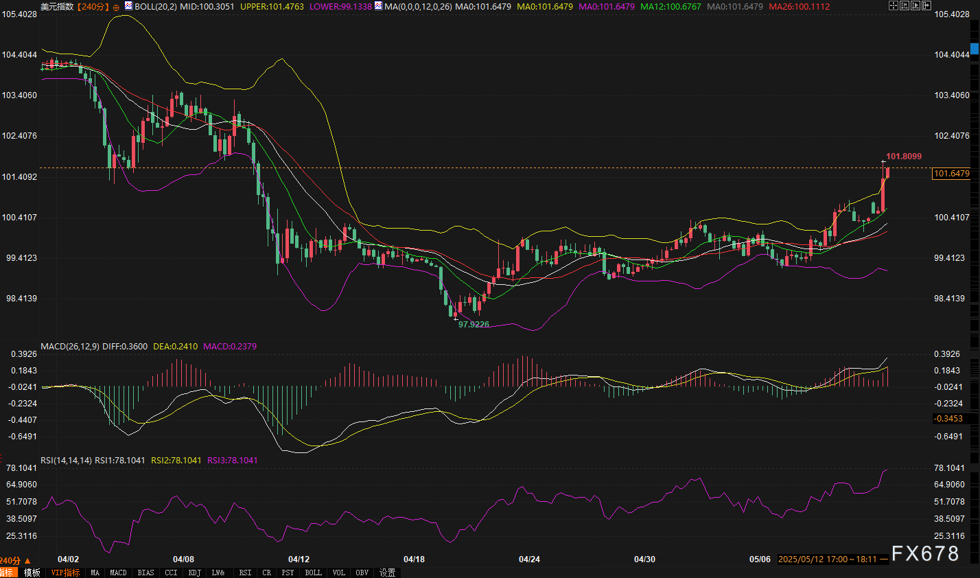 周一 5月12日 受中美贸易会谈联合声明推动 美元指数在亚洲时段迅速拉升 日内涨幅达1 20 报价攀升至101 6251 创下近三个月新高 这一突破性行情不仅反映市场对贸易摩擦缓和的积极定价 更揭示了技术面与基本面的共振效 ...