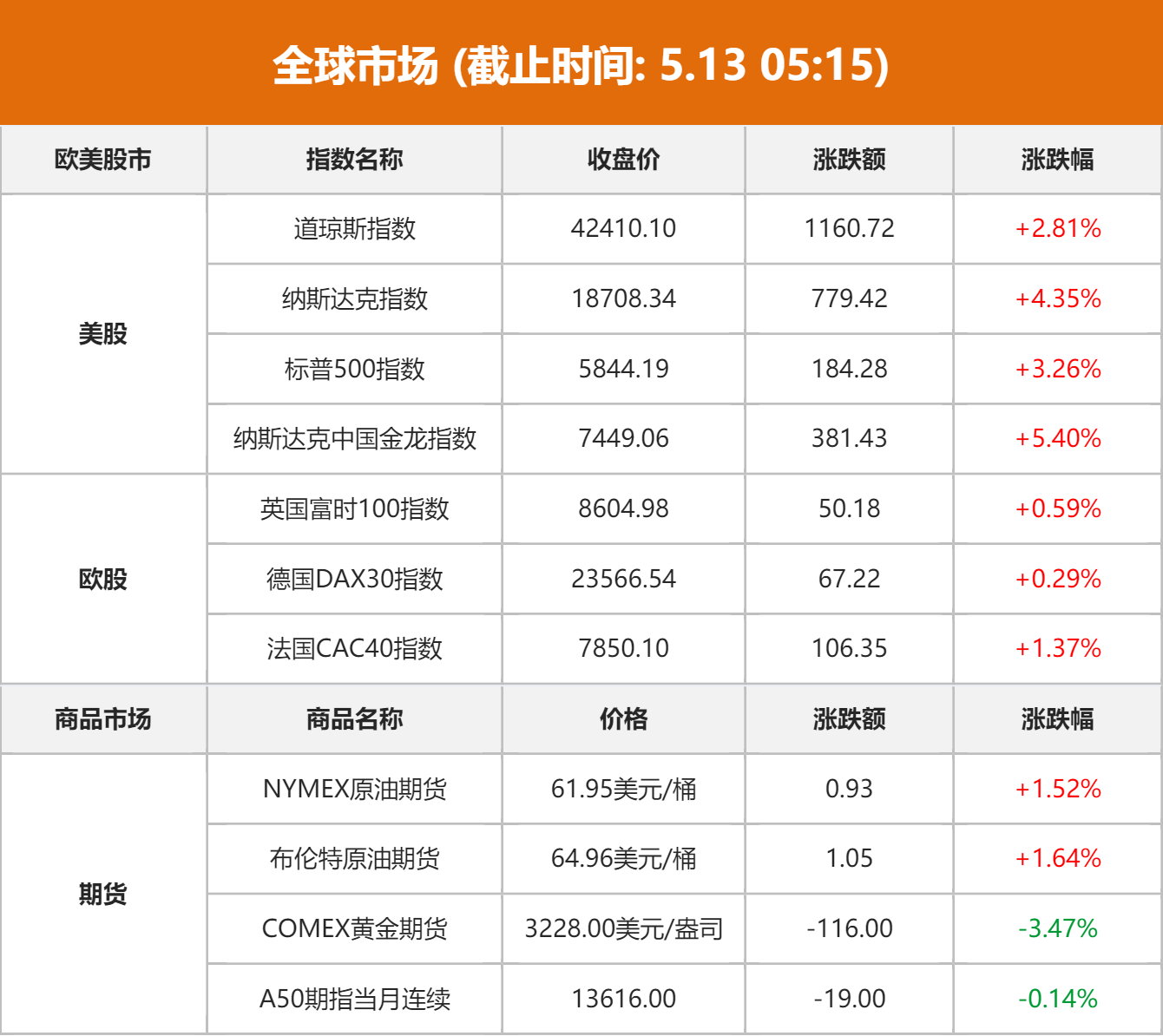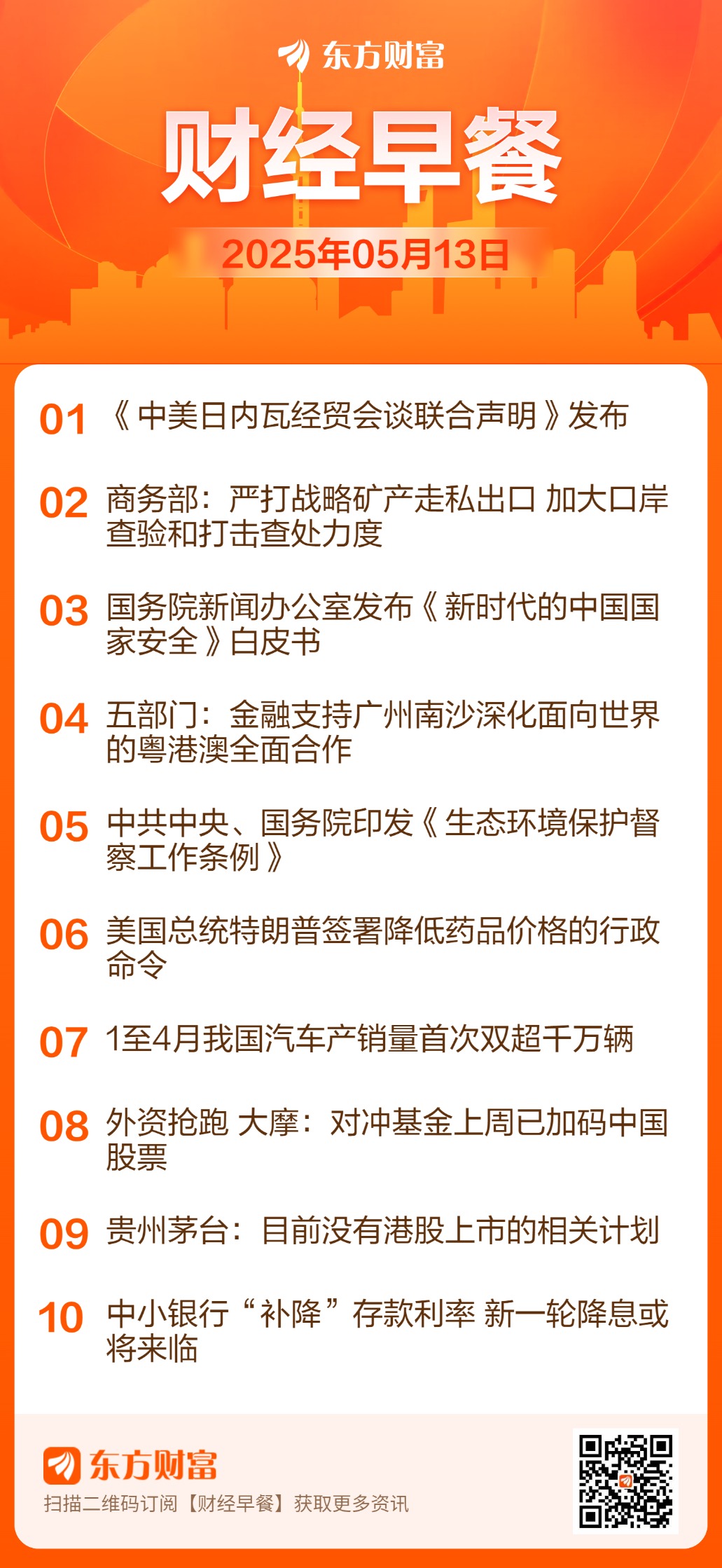 ![]() ![]() 1、新华社:中美发布《中美日内瓦经贸会谈联合声明》。美方承诺取消根据2025年4月8日第14259号行政令和2025年4月9日第14266号行政令对中国商品加征的共计91%的关税,修改2025年4月2日第14257号行政令对中国商品加征的34%的对等关税,其中24%的关税暂停加征90天,保留剩余10%的关税。相应地,中方取消对美国商品加征的共计91%的反制关税;针对美对等关税的34%反制关税,相应暂停其中24%的关税90天,剩余10%的关税予以保留。中方还相应暂停或取消对美国的非关税反制措施。 2、商务部:近日国家出口管制工作协调机制办公室部署开展了打击战略矿产走私出口专项行动。对此商务部发言人表示,加强战略矿产资源出口管制事关国家安全和发展利益。各相关部门立即开展行动,针对近期在战略矿产领域出现的伪报瞒报、夹藏走私、“第三国”转口等企图规避出口管制的违法违规行为,迅速开展跨部门调查和案情会商,加大口岸查验和打击查处力度,深挖幕后非法实体和走私网络,从严从快查办违法案件,持续提升出口管制执法效力,切实维护国家安全和发展利益。 3、新华社:国务院新闻办公室发布《新时代的中国国家安全》白皮书,旨在全面阐释新时代中国国家安全工作的创新理念、生动实践和建设成果,增进国际社会对中国国家安全的认知和理解。白皮书指出,中国统筹中华民族伟大复兴战略全局与世界百年未有之大变局,国家安全形势保持总体稳定、稳中有进,与亚太国家共同维护地区和平和发展,为动荡不安的世界注入可靠的稳定性。 4、央行:五部门联合印发《关于金融支持广州南沙深化面向世界的粤港澳全面合作的意见》。《意见》从完善创新创业金融服务、加强社会民生领域金融服务、发展特色金融服务、推进粤港澳金融市场互联互通、开展跨境金融创新与交流、完善金融监管机制等方面提出30条重点举措,推动广州南沙在粤港澳大湾区“新发展格局战略支点、高质量发展示范地、中国式现代化引领地”建设中更好发挥引领带动作用。 5、新华社:近日,中共中央、国务院印发《生态环境保护督察工作条例》。通知要求,要进一步压实抓好美丽中国建设的政治责任,牢牢牵住生态环境保护责任制这个“牛鼻子”,强化大局意识,保持严的基调,敢于动真碰硬,持续发现问题,认真解决问题,提高对党中央生态文明建设决策部署的执行力。 人民财讯:国家出口管制工作协调机制办公室组织商务部等多部门召开加强战略矿产出口全链条管控工作部署会。会议指出,战略矿产出口管制事关国家安全和发展利益,加强出口全链条管控是关键。各部门、各地方要加强对本领域、本地区相关经营主体的培训指导与日常监管,坚持“预防在先,处置在前”,密切跟踪战略矿产流向,强化信息研判共享,及时做好预警和相关处置,严防战略矿产非法外流。 第一财经:据玉渊谭天,近日,中国开展了打击战略矿产走私出口专项行动,近期还将组织一系列行动,而此前实施出口管制的中重稀土就包含在其中。此前美国研究机构就发出过担忧,中国的稀土管制使美国无力填补稀土缺口,毕竟当下超九成的稀土都要由中国进行冶炼加工。 央视网:今年以来,国家开发银行持续加强对绿色低碳循环发展重点领域的融资支持,1—4月累计发放绿色贷款超过2500亿元,重点支持了绿色基础设施、清洁能源、生态保护和污染防治等领域,为绿色发展提供了稳定的中长期资金支持。 国家粮食和物资储备局:目前,2024年度秋粮旺季收购完成,累计收购秋粮3.45亿吨,为近年来较高水平。当前,夏季粮油生产形势总体较好,小麦、油菜籽即将从南向北陆续收获上市,夏季粮油收购各项准备工作有序展开。国家粮食和物资储备局指导重点省份加快腾仓并库进度,扩大收储能力,保障农民售粮顺畅。 央视网:据青岛海关统计,今年前4个月,黄河流域9省区进出口2.05万亿元,同比增长8.8%。流域内,山东、四川进出口增速超7%,青海、甘肃、河南三省均实现两位数增长。从贸易伙伴看,对共建“一带一路”国家进出口占比达到58.3%;从出口商品看,机电产品和农产品出口增长较快。 商务部:5月12日,商务部部长王文涛主持召开外贸企业圆桌会。王文涛表示,近日,中美经贸高层会谈达成重要共识,并取得实质性进展,为进一步弥合分歧和深化合作打下了基础、创造了条件。下一步,商务部将认真贯彻落实党中央决策部署,统筹国内经济工作和国际经贸斗争,立足商务工作“三个重要”定位,会同相关部门,全力为外贸企业纾困解难,提供更多支持,帮助外贸企业开拓市场,促进外贸稳定发展。 央视新闻:中国汽车工业协会公布的数据显示,今年1至4月份,我国汽车产销量分别完成1017.5万辆和1006万辆,同比分别增长12.9%和10.8%。其中,新能源汽车产销量分别完成442.9万辆和430万辆,同比分别增长48.3%和46.2%,新能源汽车新车销量达到汽车新车总销量的42.7%。 央视网:据商务部,截至目前,2025年汽车以旧换新补贴申请量达322.5万份。自2024年汽车以旧换新政策实施以来,累计补贴申请量已突破1000万份。汽车以旧换新政策有效促进汽车消费持续回升,今年1—4月,国内乘用车零售量687.2万辆,同比增长7.9%。 第一财经:中国信通院数据显示,2025年3月,国内市场手机出货量2276.5万部,同比增长6.5%,其中,5G手机1942.4万部,同比增长9.5%,占同期手机出货量的85.3%。1-3月,