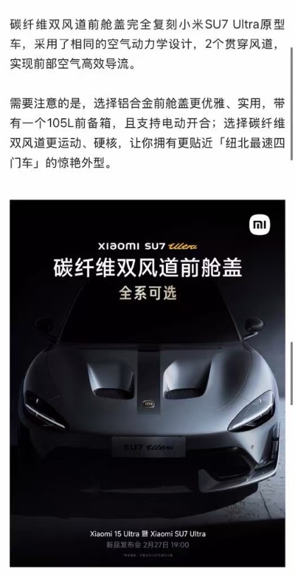 在新车YU7问世前,部分小米SU7 Ultra车主指新车不符宣传,要求退车。 5月12日,小米SU7 Ultra车主杨雷(化名)在接受澎湃新闻记者采访时表示,自己在订车时额外花费4.2万元选装碳纤维双风道前舱盖,此前小米 ...