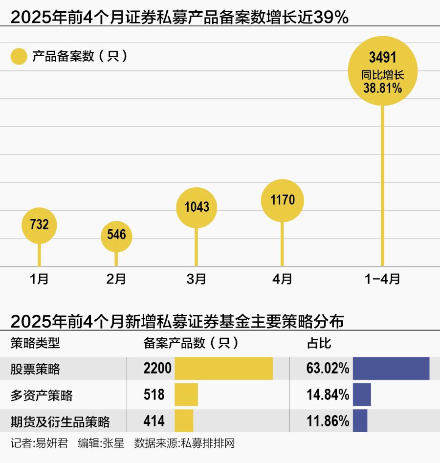 市场风险偏好回升背景下,私募证券投资基金日益活跃。 根据私募排排网最新统计,今年前4个月,已有1372家私募证券投资基金管理人备案了新产品,累计备案私募证券产品3491只,较2024年同期的2515只增长了38.81 ...