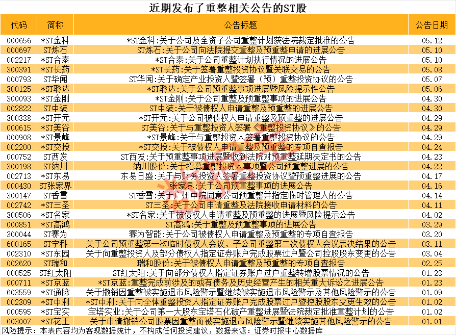 在并购重组的预期下,ST板块牛股成群。 万万没想到,5月以来,市场预期的ST板块跌停潮竟然变成了涨停潮。 数据显示,ST板块指数5月以来累计涨幅超过7%,位居概念板块涨幅榜前列。其中,5月13日有23只个股涨停,5月12日有39只个股涨停,5月9日有27只个股涨停,5月8日也高达39只个股涨停。 更令人想不到的是,今年股价涨幅超两倍的股票中,也包含两只ST股票。其中,*ST宇顺飙涨239.33%,位居A股涨幅榜第三;*ST信通飙涨230.73%,位居A股涨幅榜第五。 5月13日,*ST宇顺再次涨停,已连续录得13个涨停板,最新收盘价创2021年来新高,A股市值升至近34亿元。 两只ST股走势强劲 股价已经连跌数年的*ST宇顺今年迎来超级大反转:1月涨超7%,2月涨超13%,3月涨近11%,4月飙涨逾88%,5月以来再度大涨逾34%。值得注意的是,4月份以来,该股走势更可谓直线飙升,其间一度连续6个涨停板,最近更是连续收获13个涨停板。 该股为何突然飙升?4月下旬的一纸公告是其大涨的核心因素。 4月22日晚间,*ST宇顺发布公告称,公司于2025年4月22日与中恩云(北京)数据科技有限公司、北京申惠碧源云计算科技有限公司、中恩云(北京)数据信息技术有限公司(以下简称“标的公司”)间接控股股东Olive Ida Limited(以下简称“交易对方”)签署了《北京房山数据中心项目之合作框架协议》,公司拟以支付现金方式收购Olive Ida Limited间接持有或控制的标的公司100%股权。本次交易完成后,标的公司将成为公司的控股子公司。 据公告称,三家标的公司共同运营中恩云数据中心项目,目前该项目已经建设运营约8000个机柜。 ST板块资产重组带来的股价暴涨可谓始料未及。不过就目前来看,*ST中润(000506)的股价表现比*ST宇顺更胜一筹。该股去年7月份股价一度低至0.9元下方,最新股价飙升至7元上方,短短10个月时间最高飙升逾7倍,可谓最强ST股。 值得一提的是,*ST中润股价反转程度也相当夸张,在大涨启动前一度走出连续30个跌停。无独有偶,该股同样是因为资产重组而股价暴涨。 重组和重整的ST股出炉 近期,A股市场并购重组热度显著上升。政策环境方面,证监会主席吴清在5月7日表示,证监会正在抓紧修订上市公司重大资产重组管理办法,完善配套措施,以更大力度支持上市公司通过并购重组转型。 ST板块作为资产重组热门题材,在市场上有着较大的号召力。 据证券时报·数据宝统计,*ST中基、*ST宝实、*ST花王等公司相继发布了重组公告。其中,*ST中基拟定增收购新业能化100%股权;*ST花王拟收购尼威动力55.50%股权;*ST宝实拟收购电投新能源100%股权。 ST板块的破产重整同样暗藏机遇。据数据宝统计,今年以来,ST板块中披露了重整关键词公告的个股合计有30多只。最新披露的是*ST金科,公司5月11日晚发布了关于公司及全资子公司重整计划获法院裁定批准的公告;本周以来,公司股价也连续收获一字涨停。 部分公司公告已签署相关协议。其中,*ST长药近期发布公告称,2025年5月6日,公司和临时管理人分别与产业投资人四川嘉道博文生态科技有限公司等六家机构签署重整投资协议。 另外,ST华闻近期公告,公司于2025年5月6日与海南联合资产管理有限公司和海南省国有资本运营有限公司签署了重整投资协议。根据协议,两家产业投资人合计支付6.1亿元重整投资款,受让公司转增股份5亿股,每股价格为1.22元。 ![]() 国资ST股揭晓 央国企市值管理大背景下,国资委旗下的ST股票保壳压力较大,这意味着相关股票也有较大的重组预期。 据数据宝统计,有47只ST股票为央国企股,其中,*ST国化、*ST南置、*ST中地等个股为央企,控股股东分别为中国文化产业发展集团有限公司、中国电建地产集团有限公司、中交房地产集团有限公司。 地方国资ST股中,控股股东实力较为强大的有ST瑞科、ST特信、ST英飞拓、ST数源等。 其中,ST瑞科实控人为浙江省人民政府国资委;ST特信和ST英飞拓实控人均为深圳市国资委;ST数源实控人为杭州市人民政府;ST金一和*ST东园实控人分别为北京市海淀区人民政府国资委、北京市朝阳区人民政府国资委。 不过央国企ST股票也并不代表“十拿九稳”,比如*ST中程近期公告称,收到终止上市事先告知书。 ![]() 手持较多现金且资产负债率较低的非央国企ST股票,其“壳价值”及重组预期同样值得关注。 数据显示,一季度末资产负债率在20%以下的非央国企ST股票中,*ST东通、ST智知、ST凯利等个股一季度末在手货币资金及交易性金融资产合计均超10亿元。 不过,这类股票同样有风险,比如*ST龙宇、*ST龙津等近期均公告称收到终止上市事先告知书。 ![]() (文章来源:证券时报网) |