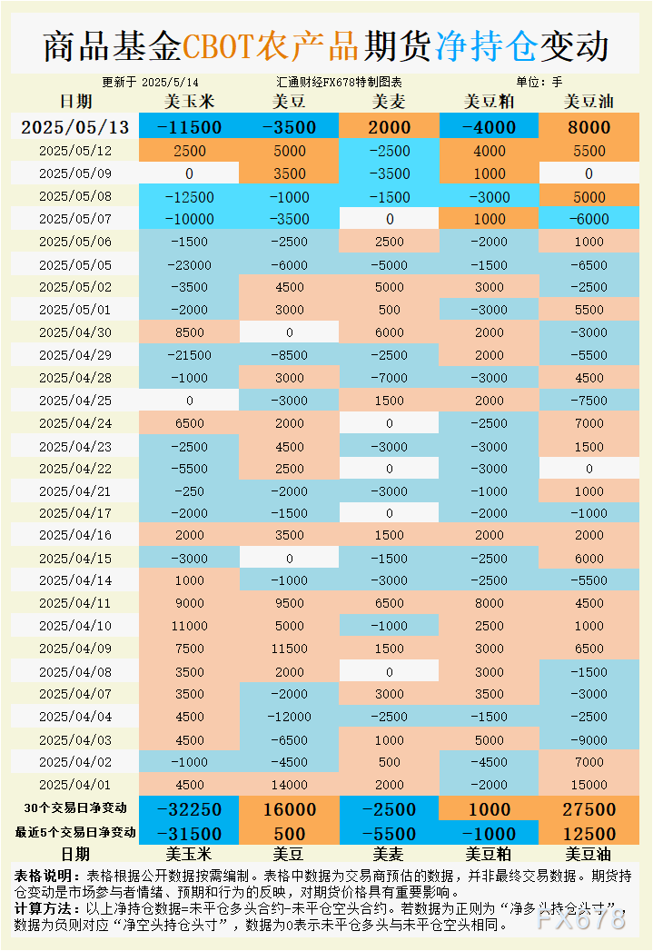 周三(5月14日),芝加哥期货交易所(CBOT)谷物期货市场延续震荡分化格局,市场情绪受基本面、持仓调整及国际交易动态的综合影响。昨日,CBOT主力合约中,大豆期货小幅收涨1.25美分/蒲式耳,报10.72-1/2美元/蒲式耳,受到美国国内种植进度加快及国际交易利好支撑;玉米期货下跌5.5美分/蒲式耳,收于4.42-1/2美元/蒲式耳,创五个月低点;小麦期货反弹2美分/蒲式耳,收于5.17-1/4美元/蒲式耳,但整体仍承压于供应宽松预期;豆粕期货下跌4.8美元/短吨,报293.3美元/短吨;豆油则因出口需求改善而表现坚挺。 ![]() CBOT小麦期货昨日反弹2美分/蒲式耳,收于5.17-1/4美元/蒲式耳,此前触及2020年8月以来最低水平。基本面来看,美国农业部(USDA)最新报告预计2025/26年度美国小麦期末库存高于市场预期,全球库存也略有增加,加剧供应宽松压力。此外,USDA周一报告显示,美国冬小麦作物状况显著改善,优良率高于预期,进一步削弱价格支撑。堪萨斯州正在进行的年度小麦作物巡查显示,产量预期稳定,但干旱对部分地区的影响仍需关注。 持仓数据方面,5月13日,商品基金增加小麦投机性净多头2000手,最近5个交易日却转为净空头5500手,反映短期多头情绪短暂回暖,但中期看空主导。这可能与俄乌局势的不确定性及欧盟软小麦出口增加有关。欧盟数据显示,截至5月11日,2024/25年度软小麦出口达1826万吨,较上周增加45万吨,显示全球供应充裕。基差方面,美国南部平原硬红冬小麦现货基差持平,农户因价格低迷惜售,现货交易活跃度受限。 走势预测:小麦期货短期可能在5.00-5.20美元/蒲式耳区间震荡,受到技术性反弹及多头增持支撑。但中期看,全球供应宽松及出口竞争加剧将限制上行空间,除非俄乌局势或天气因素引发显著扰动。 大豆:出口利好与空头压力交织 大豆期货昨日收涨1.25美分/蒲式耳,报10.72-1/2美元/蒲式耳,受到USDA报告及国际交易利好的双重提振。USDA周一报告显示,美国2024/25年度大豆期末库存低于市场预期,提振市场情绪。此外,近期国际交易动态显示,对美国大豆的需求有所回暖,尽管巴西仍具价格优势。美国国内种植进度加快,截至周日,大豆种植完成48%,高于五年均值37%,显示供应端压力渐增。 持仓数据揭示,5月13日,商品基金增加大豆投机性净空头3500手,但最近5个交易日净多头增加500手,30个交易日净多头累计增加1.6万手,反映短期看空情绪升温,但中期仍存乐观预期。基差方面,美国墨西哥湾CIF大豆驳船基差坚挺,5月装船基差较CBOT7月期货高62美分/蒲式耳,6月基差升至67美分/蒲式耳,反映出口商需求旺盛及农户惜售。FOB出口溢价保持在77美分/蒲式耳,显示国际竞争力稳定。 走势预测:大豆期货短期可能在10.50-11.00美元/蒲式耳区间盘整,受到出口需求支撑及空头回补的推动。中期走势需关注南美供应及国际交易动态,若中国采购持续回暖,价格或测试11.20美元/蒲式耳阻力位。 豆油:多头情绪高涨,需求驱动上行 豆油期货昨日表现坚挺,受到全球植物油需求增加及供应紧张预期的支撑。基本面来看,加拿大油菜籽产量预期下调及印尼对使用过的食用油出口限制,推升全球植物油价格。此外,美国生物柴油需求的潜在增长为豆油提供长期支撑。美国国内压榨量创纪录,豆油供应充足,但出口需求旺盛抵消了部分压力。 持仓数据方面,5月13日,商品基金增加豆油投机性净多头8000手,最近5个交易日净多头增加1.25万手,30个交易日累计增加2.75万手,显示市场对豆油价格前景高度乐观。基差方面,美国墨西哥湾豆油基差变动有限,反映需求稳定。 走势预测:豆油期货短期有望延续强势,价格可能在42-45美分/磅区间波动,受到多头情绪及全球需求支撑。中期来看,植物油供应紧张预期及生物燃料政策利好或推动价格进一步上行,需关注南美天气及出口数据。 豆粕:供应宽松压制价格,空头主导 豆粕期货昨日下跌4.8美元/短吨,收于293.3美元/短吨,受到供应宽松及需求疲软的压制。基本面显示,美国压榨产能高企,豆粕库存持续增加,叠加南美大豆丰产预期,全球供应充裕。USDA报告虽下调美国大豆产量,但对豆粕价格的提振有限。经销商报告显示,近期豆粕需求疲软,拖累价格表现。 持仓数据方面,5月13日,商品基金增加豆粕投机性净空头4000手,最近5个交易日净空头增加1000手,反映市场对豆粕前景的谨慎态度。然而,30个交易日净多头增加1000手,显示长期需求预期仍存分歧。基差方面,美国墨西哥湾及中西部卡车运输豆粕基差稳中趋弱,部分地区下跌1-5美元/短吨,反映现货市场交易清淡。 走势预测:豆粕期货短期可能在290-300美元/短吨区间低位震荡,受到空头压力及供应宽松的制约。中期走势需关注全球饲料需求及南美供应情况,若需求未显著改善,价格上行空间有限。 玉米:技术性抛售加剧跌势,空头情绪浓厚 玉米期货昨日下跌5.5美分/蒲式耳,收于4.42-1/2美元/蒲式耳,创五个月低点,受到技术性抛售及基本面压力的双重影响。USDA报告显示,美国玉米种植进度达62%,高于五年均值56%,理想的种植天气加剧供应宽松预期。国际市场方面,阿尔及利亚新招标采购32万吨饲料玉米,仅限阿根廷和巴西来源,显示美国出口竞争力受限。 持仓数据揭示,5月13日,商品基金增加玉米投机性净空头1.15万手,最近5个交易日净空头增加3.15万手,30个交易日累计净空头增加3.225万手,显示看空情绪主导。一知名机构指出,基金在USDA数据发布前大幅削减玉米多头头寸,