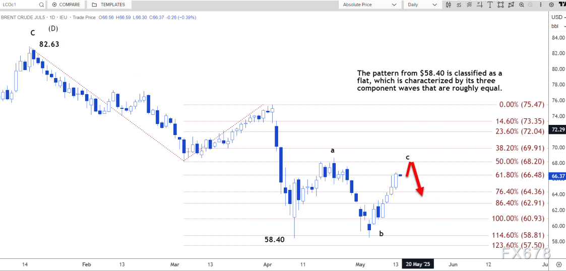 周三(5月14日)亚洲时段,国际油价震荡微跌,布伦特原油目前交投于66.26美元/桶附近。路透技术分析师指出,布伦特原油可能回落至每桶 65.05 美元至 65.69 美元的区间,因为自 58.40 美元开启的上涨趋势可能在 66.80 美元的阻力位附近结束。 ![]() ![]() 当前的c浪可能跌至65.20美元。如果市场突破68.20美元,该形态将被重新归类为更具看涨性的双底形态。 北京时间14:13,布伦特原油现报66.26美元/桶。 ![]() |