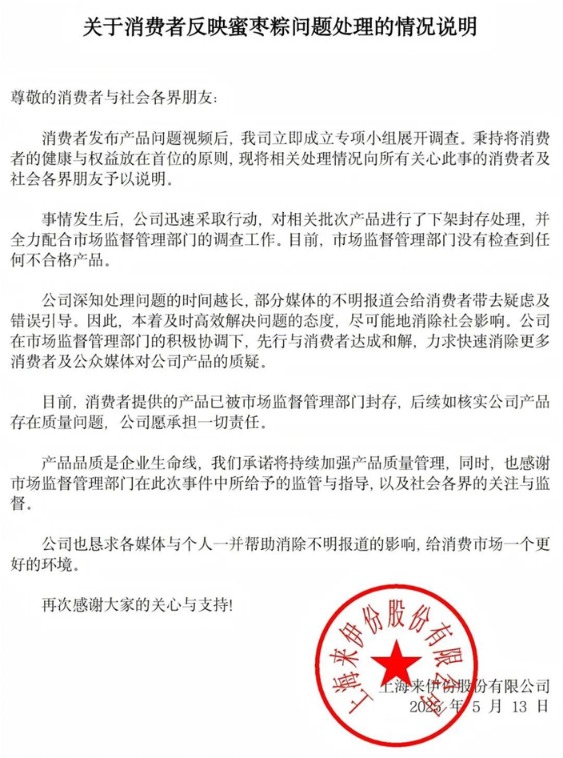 针对“粽子中吃出疑似带血创可贴”的消费者投诉,来伊份与产品代工企业五芳斋自5月12日以来接连发文回应。其中,来伊份两度回应本次食品安全事件。 5月10日,江苏一名消费者苏女士发视频投诉称在来伊份的粽子中吃出异物。该消费者在视频中表示,给小孩喂粽子,在里面发现了异物,“(为)创可贴……这个地方明显是血”,并要求来伊份官方给一个明确的回应。 该消费者还在评论区表示,该产品生产工厂与五芳斋是同一家。涉事蜜枣粽产品来自来伊份的“高粽”系列,其委托单位为“上海来伊份股份有限公司”,受委托单位为“浙江五芳斋实业股份有限公司”。 对于此事,证券时报·e公司记者多次联系五芳斋,公司负责人称以公司后续发布的情况说明为准。 五芳斋在5月12日深夜发布情况说明表示,关注到合作品牌方来伊份的蜜枣粽产品的网络舆情,高度重视上述网络舆情,第一时间成立专项工作小组,对生产流程进行深入排查。 来伊份在5月13日的最新回应中表示,已对相关批次产品进行了下架封存处理,并在市场监督管理部门的积极协调下,先行与消费者达成和解。 来伊份涉事蜜枣粽产品已下架 来伊份5月12日早间发布公告称,公司关注到公司蜜枣粽产品的相关舆情,管理层第一时间组织专项工作小组对相关问题进行全面核查;已启动全链路调查程序,并积极与相关消费者沟通。 来伊份还表示,该公司已全面下架本批次蜜枣粽产品,消费者可选择就近门店进行退换货,并可得到相同金额的额外补偿。 随后来伊份在5月13日再度发布“关于消费者反映蜜枣粽问题处理的情况说明”,说明称,事情发生后,来伊份对相关批次产品进行了下架封存处理,并全力配合市场监督管理部门的调查工作。目前,市场监督管理部门没有检查到任何不合格产品。 ![]() 说明还表示,来伊份在市场监督管理部门的积极协调下,先行与消费者达成和解,力求快速消除更多消费者及公众媒体对公司产品的质疑。日前,消费者提供的产品已被市场监督管理部门封存,后续如核实公司产品存在质量问题,公司愿承担一切责任。 五芳斋:手部受伤员工不参与裹粽环节 5月12日深夜,五芳斋在官网披露情况说明,表示关注到合作品牌方来伊份的蜜枣粽产品的网络舆情,公司高度重视上述网络舆情,第一时间成立专项工作小组,对生产流程进行深入排查,协同合作品牌方对相关问题进行全面核查,主动配合相关部门现场检查。 五芳斋称,根据公司相关管理规定,粽子生产过程中的每道工序均设有质检员,并由专人对车间员工进行作业前检查,手部受伤员工不得参与裹粽等与食品直接接触的环节。 其他非直接接触食品的车间员工如需使用创可贴,则由专人发放和回收含金属材质的专用蓝色创可贴(可有效识别),同时要求佩戴专用一次性手套后方可作业。 同时,五芳斋表示,公司秉承实事求是的原则,持续跟进消费者反映的情况,及时妥善予以处理并解决,如存在问题,公司将严肃处理并追究相关人员责任。 ![]() 两家上市公司去年业绩均下滑 来伊份于1999年在上海成立,并于2016年10月在上交所主板上市,成为A股的休闲零食第一股。据了解,来伊份主要通过委托生产的方式在全渠道销售自主品牌休闲零食,其销售休闲零食的主要渠道为线下直营门店,同时亦布局了加盟门店、经销特通渠道和电商板块。 截至2024年年底,来伊份拥有门店3085家,较年初净减少600家。2024年,来伊份收入同比减少15.25%至33.70亿元,并且由盈转亏,净亏损为7526.76万元。 年报显示,营业收入变动主要是来伊份部分区域门店收入下降且对部分低效门店进行调整,导致直营收入受影响同比下降,当期收入有所下滑。 来伊份在年报中表示,报告期内,公司主动顺应行业趋势,积极响应政策导向,适时进行战略优化,但由于部分城市消费降级趋势明显及行业激烈竞争的加剧,仍对公司的市场空间和利润空间形成了压力。 2025年第一季度,来伊份实现营业收入10.48亿元,同比减少1.23%;实现归母净利润1243.57万元,同比减少79.72%。 资料显示,五芳斋创始于1921年,并于2022年8月上市,主营业务是以糯米食品为主导的食品研发、生产和销售,是全国首批“中华老字号”企业,也曾荣获“中国餐饮百强企业”。目前拥有嘉兴、成都两大生产基地。截至2024年12月31日,五芳斋通过直营、合作经营、加盟、经销等方式建立了476家门店。 2024年,五芳斋实现营业收入约为22.51亿元,同比下降14.57%;对应实现归母净利润约为1.42亿元,同比下降14.24%。2025年一季度,该公司营业收入为2.43亿元,同比增长17.24%;归母净利润为亏损4523.49万元,同比减亏。 五芳斋表示,2024年,公司主动收缩低效经销网络、强化渠道库存管控,打了一套“组合拳”。五芳斋全年关闭低效门店86家,新开直营店、合营店、经销店、加盟店分别为13家、2家、87家和35家,累计门店数达到476家。 (文章来源:证券时报网) |