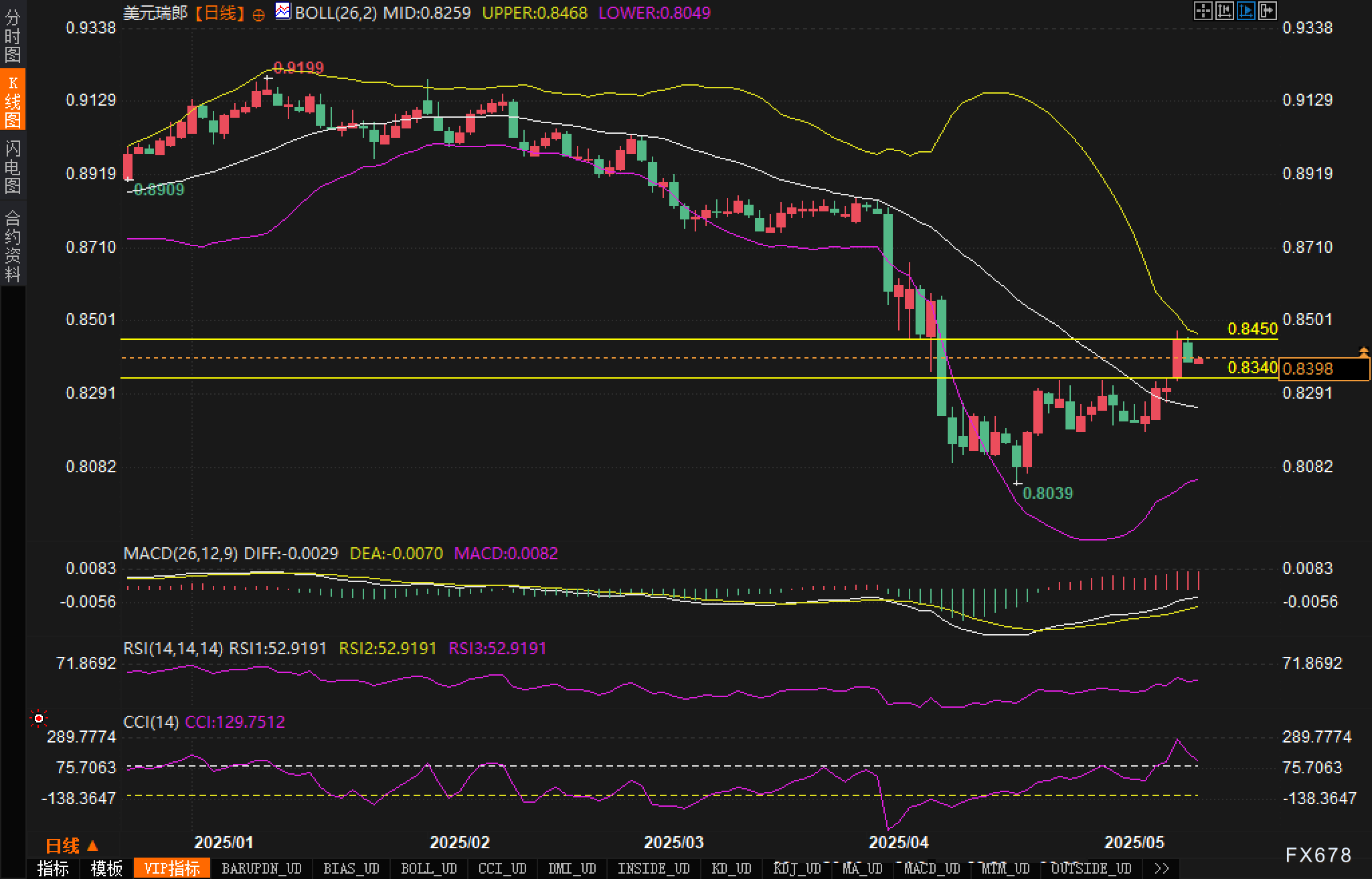 周三 5月14日 美元兑瑞郎汇价窄幅盘整 亚洲时段交投于0 8390附近 在经历四月的急剧下跌后 汇价正尝试筑底企稳 但技术指标显示下行风险依然存在 与此同时 全球贸易关系改善与美联储政策前景变化 正在重塑市场风险情 ...