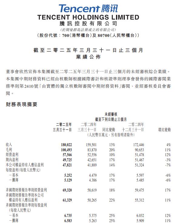 腾讯控股发布第一季度业绩报告,第一季度营收1,800.2亿元人民币,同比增长13%,预估1,756亿元人民币;第一季度公司权益持有人应占盈利478.2亿元人民币,同比增长14%,预估516.9亿元人民币;非国际财务报告准则经 ...
