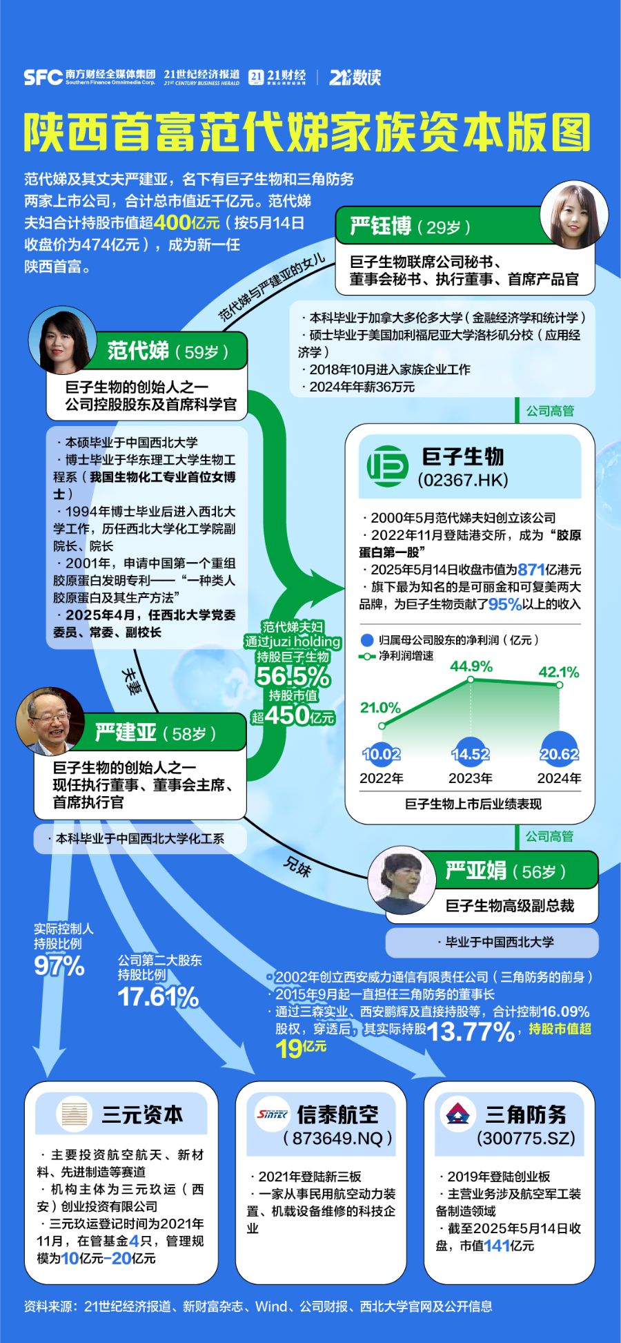 近日,“西北大学副校长范代娣成陕西首富”这一话题引起热议,范代娣家族也走进了人们的视野。 范代娣是谁?她是巨子生物的创始人之一,也是新上任的西北大学副校长。 在2024年胡润全球富豪榜中,范代娣、严建亚夫妇以315亿元人民币财富位列榜单827位。受上市公司市值波动影响,他们成为新一任陕西首富:旗下两家上市公司总市值合计近千亿元,两人的持股市值也高达400多亿元(按5月14日收盘价为474亿元)。 一图速览范代娣的传奇人生以及家族资本版图: ![]() (文章来源:21世纪经济报道) |