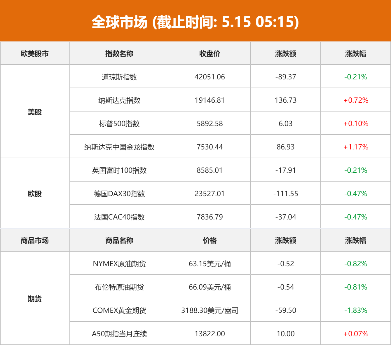 ![]() 美股市场:美股三大指数14日涨跌不一,纳指连涨第六天,标普三连涨。截至当天收盘,道琼斯工业平均指数比前一交易日下跌89.37点,收于42051.06点,跌幅为0.21%;标准普尔500种股票指数上涨6.03点,收于5892.58点,涨幅为0.10%;纳斯达克综合指数上涨136.72点,收于19146.81点,涨幅为0.72%。 大型科技股多数上涨,特斯拉涨超4%。消息面上,马斯克与卡塔尔央行行长、卡塔尔投资局主席进行了会谈。英伟达涨超4%,谷歌涨超3%,奈飞涨逾1%,微软、Meta小幅上涨;英特尔跌超4%,亚马逊、苹果小幅下跌。其中,英伟达年内转涨。 ![]() 热门中概股多数上涨,纳斯达克中国金龙指数收涨1.17%。腾讯音乐涨逾15%,理想汽车涨近3%,阿里巴巴、好未来涨近2%,百度涨超1%. 欧股市场:欧洲三大股指当天全线下跌。英国伦敦股市《金融时报》100种股票平均价格指数14日报收于8585.01点,较前一交易日下跌17.91点,跌幅为0.21%。法国巴黎股市CAC40指数报收于7836.79点,较前一交易日下跌37.04点,跌幅为0.47%;德国法兰克福股市DAX指数报收于23527.01点,较前一交易日下跌111.55点,跌幅为0.47%。 商品市场:COMEX黄金期货结算价下降59.50美元,降幅1.83%,报3188.30美元/盎司。分析人士称,避险需求减弱与降息预期博弈是近期黄金承压的主要因素。国际油价14日下跌。截至当天收盘,纽约商品交易所6月交货的轻质原油期货价格下跌52美分,收于每桶63.15美元,跌幅为0.82%;7月交货的伦敦布伦特原油期货价格下跌54美分,收于每桶66.09美元,跌幅为0.81%。 隔夜要闻“美国客户比我们还急”!中美关税调整 中国厂家“电话被打爆” 航运公司也“爆单”了 近日,中美贸易局势明显缓和。众多外贸企业纷纷惊呼“美国订单来了”。北京时间5月12日下午3点,《中美日内瓦经贸会谈联合声明》发布,中美双方各取消91%的关税,暂停实施24%的对等关税90天。北京时间5月14日12:01(美东时间5月14日凌晨00:01),中美双方正式调整了关税政策。 这两天,中美间的外贸往来迅速升温:深圳一家外贸企业半天时间就收到了6个美国客户的“催单call”,要求发货“越快越好”;上海一家国际物流企业接到的客户询单一个接一个;美国一家货运代理企业创始人瑞安·彼得森则在社交平台上提醒,“准备迎接海运高峰吧”。 白宫:特朗普在卡塔尔达成历史性的1.2万亿美元经济承诺 白宫在声明中表示,特朗普与卡塔尔签署了一项协议,价值至少1.2万亿美元。特朗普还宣布美国与卡塔尔达成总额超过2435亿美元的经济协议。 沙特阿美与多家美国企业达成34项合作 总价值或达900亿美元 就在特朗普离开沙特访问卡塔尔之际,沙特阿拉伯国家石油公司(沙特阿美)与多家美国企业签署合作文件,总价值可能高达约900亿美元。 桥水Q1持仓展现“避险原则”:爆买阿里巴巴 斩仓标普新进黄金ETF 北京时间周四凌晨,知名投资机构桥水基金向SEC递交截至今年3月31日的一季度持仓报告(13F表)。桥水在一季度的操作,已然展现出迎接特朗普上台的避险动作,以及对“东升西降”题材的涉猎。在最受关注的前十大仓位方面,桥水报告了非常有趣的异动。首先,前三大持仓的排序虽然没变,但第一大持仓SPDR标普500ETF(SPY)遭到近6成的大幅度减持,占整体仓位的比例也从去年四季度的22%降至不足9%。 美联储副主席:预计经济增长将放缓 通胀或反弹但待观察 美联储副主席菲利普·杰斐逊(Philip Jefferson)最新表示,关税以及相关的不确定性可能在今年减缓美国经济增长、推高通胀。但他指出,货币政策已做好准备,将在必要时做出反应。 特朗普“嘴瓢”引发虚惊一场:160架波音客机怎么值2000亿美元 当地时间周三,美国总统特朗普访问中东行程的第二站卡塔尔,并宣布达成一系列“大交易”。作为整个行程的小插曲,特朗普在与卡塔尔埃米尔(国家元首)塔米姆共同出席合作协议签署仪式期间,意外搞错波音飞机的订单价格。 克宫给出回应:俄罗斯代表团将在土耳其“等候”乌克兰人 当地时间周三(5月14日),俄罗斯总统新闻秘书佩斯科夫表示,俄罗斯代表团将于周四在伊斯坦布尔等候乌克兰代表团,双方将进行直接对话。 特朗普放话:伊朗永远不可能拥有核武器 当当地时间周二(5月13日),美国总统特朗普表示,伊朗是中东“最具破坏性的力量”,他指责伊朗制造中东地区的不稳定,并警告称美国绝不会允许伊朗获得核武器。 美韩汇率谈判传闻勾起“海湖庄园协议”担忧 美元承压走弱 随着周三“美韩官员讨论汇率政策”的消息传出,市场对特朗普政府推动美元贬值的揣测升温,美元重回弱势下跌状态。据媒体援引知情人士称,在5月5日的米兰会议期间,韩国企划财政部副部长崔志荣与美国财政部分管国际金融事务的助理部长罗伯特·卡普罗斯会面,两人“讨论了汇率政策”并将“持续进行相关对话”。 诺和诺德与Septerna达成合作协议 将共同开发新一代减肥药物 当地时间周三,诺和诺德公司宣布,已经与美国生物技术公司Septerna达成了一项合作与许可协议,将共同开发治疗肥胖症、2型糖尿病和其他心血管疾病的口服小分子药物,不过重点是口服减肥药。美股盘前,Septerna股价暴涨66%。 |