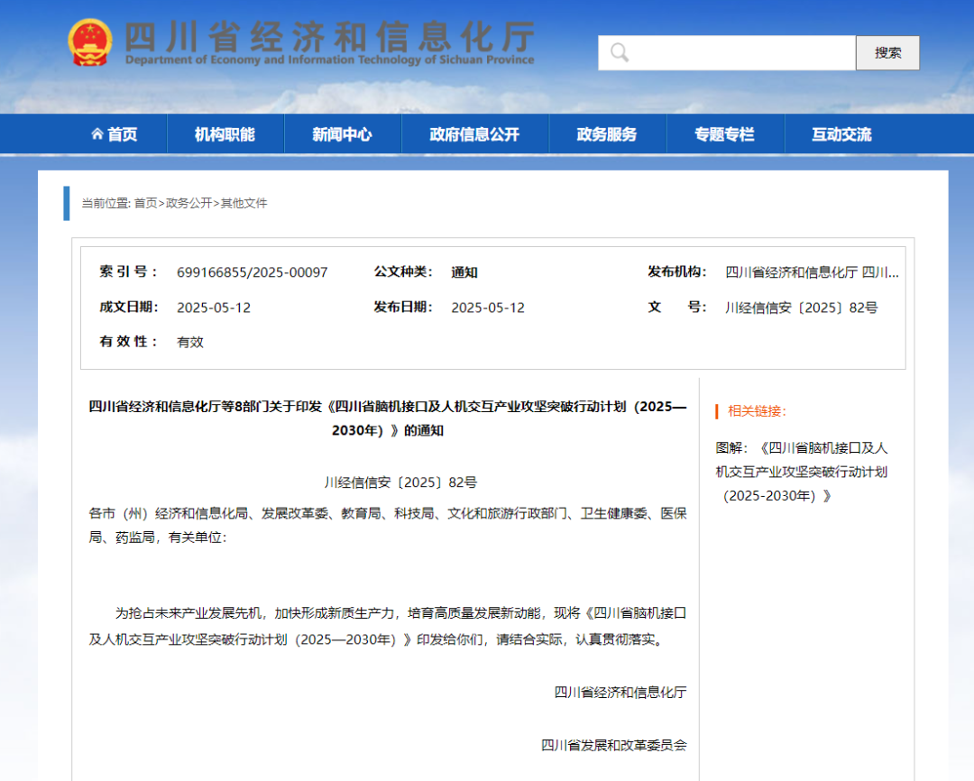 日前,四川省经济和信息化厅等八部门联合印发《四川省脑机接口及人机交互产业攻坚突破行动计划(2025—2030年)》(以下简称《行动计划》)。《行动计划》是四川推进脑机接口及人机交互产业发展的指导性文件,提 ...