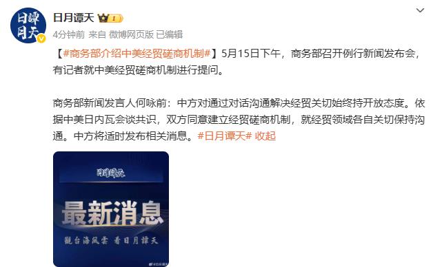 据日月谭天,5月15日下午,商务部召开例行新闻发布会,有记者就中美经贸磋商机制进行提问。 商务部新闻发言人何咏前:中方对通过对话沟通解决经贸关切始终持开放态度。依据中美日内瓦会谈共识,双方同意建立 ...