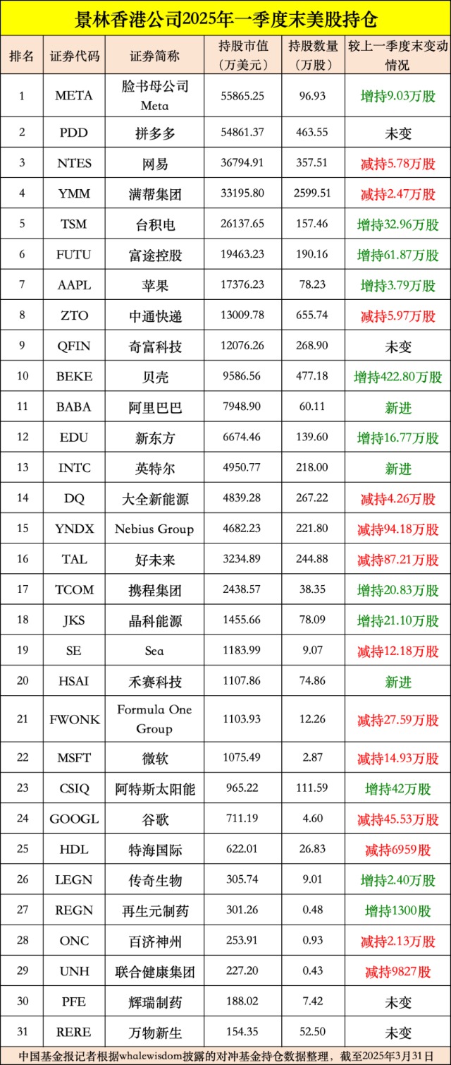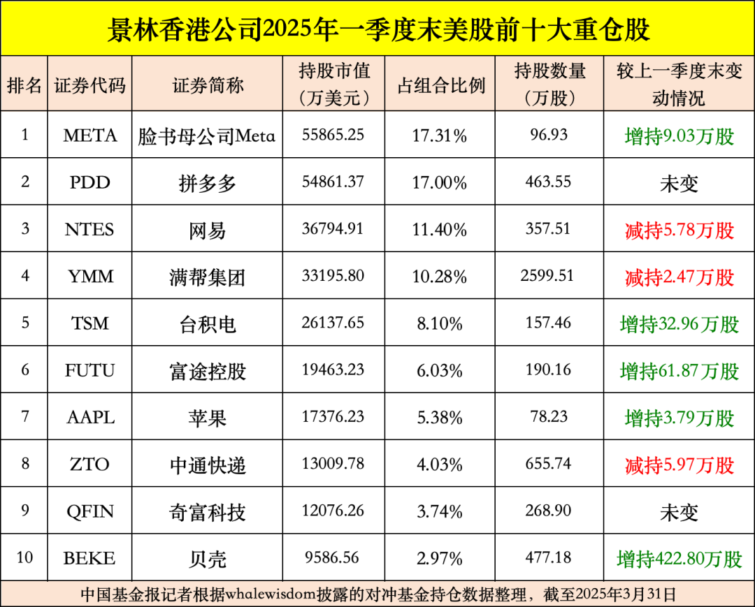 私募巨头景林资产的海外子公司景林资产管理香港有限公司(以下简称景林香港公司),近期向美国证券交易委员会(SEC)提交了截至2025年一季度末的美股持仓数据,其持仓总市值为32.28亿美元(约合232.78亿元人民币),较去年底有所增加。 今年一季度,景林香港公司新进阿里巴巴、禾赛科技等,加仓了脸书母公司Meta、贝壳、台积电、新东方等,减持了谷歌、微软、Sea、好未来等,清仓了英伟达、亚马逊、VISA等公司。 记者从渠道了解到景林资产的最新观点,公司表示,当前市场情绪有所改善,继续对中国资产保持乐观,寻找“阿尔法”的投资机会。 一季度末持有32.28亿美元 前十大重仓股占比86.24% 根据SEC披露的13F文件,截至2025年3月31日,景林香港公司今年一季度末在美股市场持有31只证券,合计持仓总市值为32.28亿美元,较去年底的31.65亿美元增长约2%。 从调仓情况看,今年一季度其新买进了3只证券,加仓了11只证券,同时,清仓了8只证券,减持了13只证券。 ![]() 需要说明的是,13F披露的美股持仓为景林海外产品持仓,不包含境内募资产品的海外持仓。 具体来看,截至2025年一季度末,景林香港公司在美股市场的前十大重仓股分别是脸书母公司Meta、拼多多、网易、满帮集团、台积电、富途控股、苹果、中通快递、奇富科技、贝壳,合计持股市值为27.84亿美元,占其美股持仓总市值的86.24%左右,较去年底持股集中度有所上升。 ![]() 记者留意到,景林香港公司已经连续两个季度加仓脸书母公司Meta,今年一季度增持约9万股,持股数量增至96.93万股,季末持仓市值为5.59亿美元,占组合比例的17.31%,为第一大持仓。 该公司对地产行业的贝壳的增持幅度超过777%,加仓422.80万股,持股达到477.18万股,一季度末持有市值为9586.56万美元,占组合比例的2.97%;加仓富途控股61.87万股,持股增至190.16万股,期末持仓市值为1.95亿美元;加仓台积电32.96万股,期末持股增至157.46万股,持股市值为2.61亿美元,占组合比例的8.10%;小幅增持科技巨头苹果,持股增至78.23万股,期末持有市值为1.74亿美元。 前十大重仓股中,景林香港公司小幅减持网易、满帮集团、中通快递,期末持仓市值分别为3.68亿美元、3.32亿美元、1.30亿美元。 加仓阿里、禾赛科技、新东方等 清仓英伟达、亚马逊、VISA等 今年一季度,景林香港公司大举加仓多只中概股,其中,新进禾赛科技74.86万股,持股市值为1107.86万美元,禾赛科技是一家自动驾驶及高级辅助驾驶(ADAS)激光雷达企业,2023年2月在纳斯达克上市;新进阿里巴巴60.11万股,季末持仓市值为7948.90万美元;加仓新东方16.77万股,持股增至139.60万股,持有市值为6674.46万美元;加仓携程集团20.83万股,期末持股增至38.35万股,持有市值为2438.57万美元。 增持方面,景林香港公司一季度新进英特尔218万股,期末持有市值为4950.77万美元;此外,加仓了阿特斯太阳能、再生元制药等。 ![]() 减持方面,景林香港公司在今年一季度卖掉了谷歌45.53万股,持股仅剩4.60万股,减持幅度达到91%左右;还卖掉微软将近84%的仓位,减持14.93万股,持股降至2.87万股。 该公司还减持了Sea、Formula One Group、百济神州、好未来、Nebius Group、大全新能源等公司的部分持仓。 值得注意的是,景林香港公司在一季度清仓了AI算力龙头英伟达,卖掉了3.78万股,在持有该股多个季度以后选择退出。 该公司还砍掉了电商巨头亚马逊的持仓,一季度卖掉3.21万股;还清仓了VISA公司、优步、腾讯音乐、DoorDash等。 记者从渠道了解到景林资产的最新观点。 景林资产表示,市场情绪有所改善,对中国资产保持乐观,寻找“阿尔法”的投资机会。首先,决策层不断加大政策刺激力度,对市场形成支撑;再者,监管机构鼓励上市公司加大回购,预期上市公司2025年的股东回报将进一步提升;中国企业正在迅速发展,并在全球变得更加具有竞争力,如中国的电动汽车、家电、智能手机、清洁能源设备等行业的龙头企业正在全球扩张并提升市场份额;中国巨大的内需市场正在新兴消费领域催生行业领导者,包括特色餐饮、收藏玩具、生活方式、宠物经济、数字娱乐等细分赛道。 景林资产称,近期市场大幅波动后,中国股市估值具备吸引力。中美经贸高层会谈取得实质性进展,市场风险偏好出现明显回升。景林将一如既往地聚焦于企业基本面研究,挖掘和把握优质公司的投资机会,与优秀企业共同成长。 (文章来源:中国基金报) |