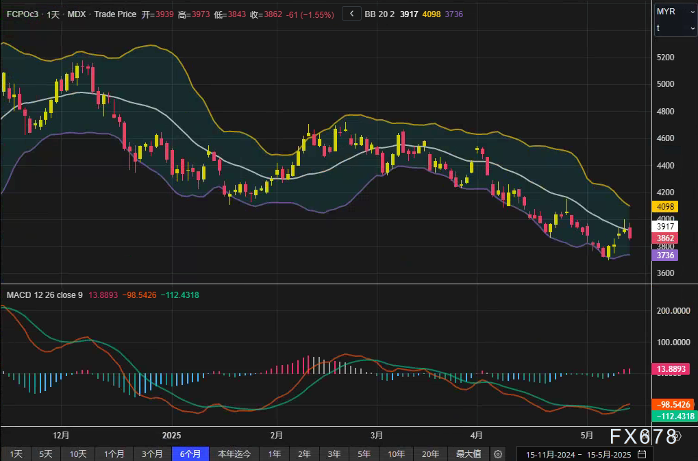 周四 5月15日 马来西亚衍生品交易所 BMD 棕榈油主力合约FCPOc3结束四连涨 收报3862林吉特 吨 单日跌幅1 55 盘面技术指标显示 布林带中轨位于3917林吉特 MACD柱状图延续负值 短期动能偏弱 尽管马来西亚5月上 ...