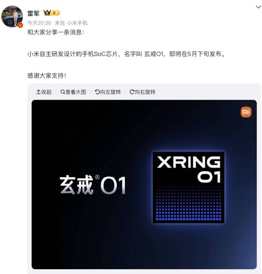 5月15日晚间,小米集团创始人、董事长兼CEO雷军在微博发文:小米自主研发设计的手机SoC芯片,名字叫玄戒O1,即将在5月下旬发布。 “小米十年造芯路,始于2014/9。”随后,雷军在自己微博下评论道。 或采用 ...