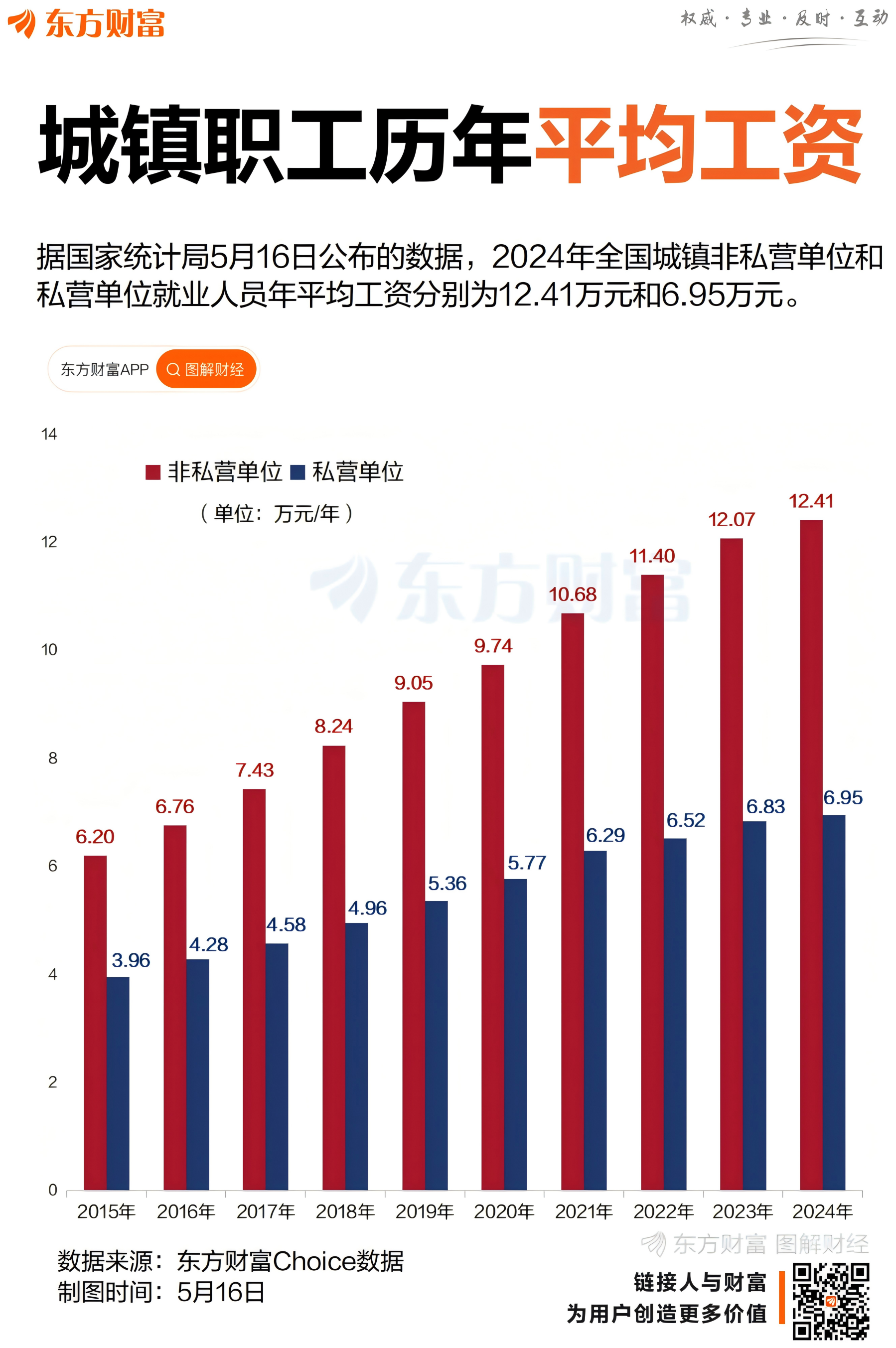 据国家统计局5月16日公布的最新数据,2024年城镇非私营单位职工平均工资(税前,下同)124110元,月均10343元;城镇私营单位职工平均工资69476元,月均5623元。城镇非私营单位平均工资名义同比增速为2.8%,私营 ...