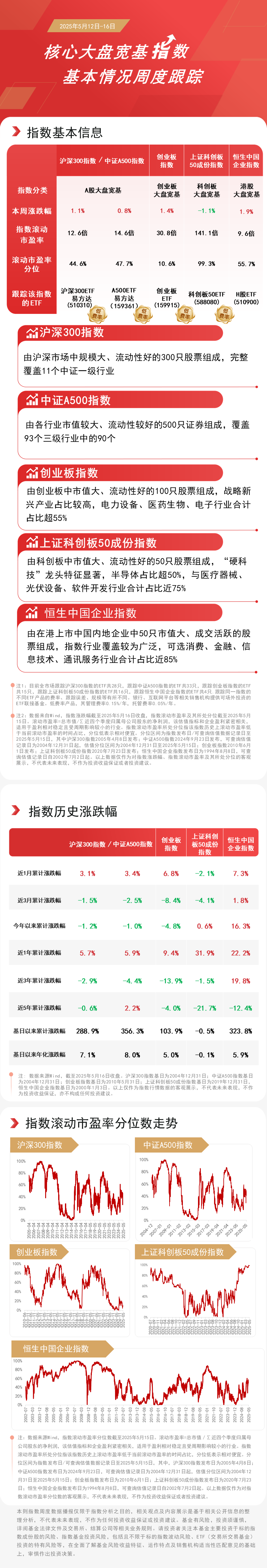A股本周震荡上行,板块题材上,港口航运、互联网电商、保险等板块涨幅居前,贵金属、软件开发等板块跌幅居前;港股方面,科技与消费板块走强。本周沪深300指数上涨1.1%,中证A500指数上涨0.8%,创业板指数上涨1.4%,上证科创板50成份指数下跌1.1%,恒生中国企业指数上涨1.9%。