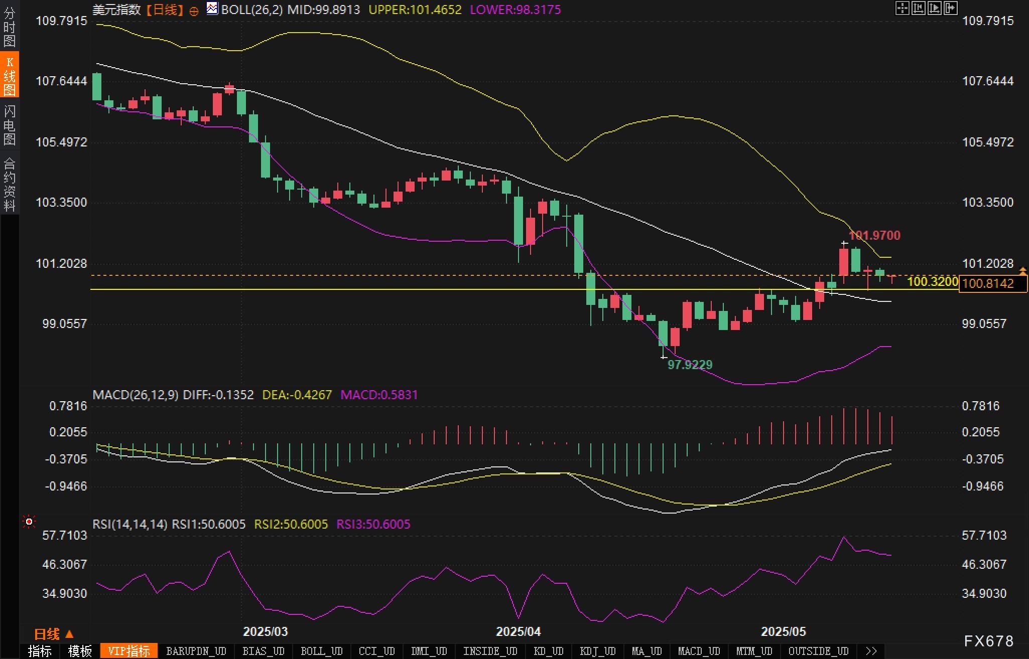 周五(5月16日),美元指数(DXY)处于盘整状态,美市盘前徘徊在100.80水平附近。在市场质疑特朗普政府贸易政策稳定性的背景下,美元指数本周有可能由正转负。随着美国经济数据显示价格压力与消费支出同步降温,美元在周四出现了明显回落。 ![]() 近期公布的美国经济数据显示经济动能正在减弱。上月生产者价格指数(PPI)出人意料地环比下降,而零售销售仅微增0.1%,远低于3月份1.5%的强劲增幅。这些数据暗示美国经济面临通缩风险,消费增长显著放缓。 美国经济日历重要数据包括:4月建筑许可预计下降至145万,低于3月的146.7万;4月出口价格预期下降0.5%,进口价格预期下降0.4%,降幅较前期扩大;密歇根大学5月初步消费者信心指数预期小幅上升至53.4,高于4月终值的52.2;5年通胀预期预计保持在4.4%。 欧洲权益市场周五飙升近1%,美国期货表现稍逊但仍录得0.5%以下的涨幅。CME FedWatch工具显示,市场预期美联储6月降息概率仅为8.2%,7月30日决议降息概率为38.6%。美国10年期国债收益率在周四触及4.54%高点后回落至4.41%左右。 技术面: 美元指数或处于危机边缘,越来越多的金融市场参与者开始质疑美元的储备货币地位,特别是考虑到特朗普政府政策的不稳定性。从技术图表来看,美元指数曾于2025年4月触及97.92的低点,随后展开反弹。当前价格在101附近遇到关键阻力位,这一水平恰好与长期下降趋势线重合。 ![]() 布林带指标显示当前价格运行在中轨附近,上轨位于101.47,下轨位于98.32,带宽有所收窄,暗示波动性收缩后可能出现大幅波动。近期美元指数在100.32-101.97区间内波动,若向上突破可能测试103水平,而下破则可能重新考验97.92的关键支撑。 市场情绪观察 当前市场对美元的情绪正在经历复杂转变。交易员行为显示出明显的谨慎态度,美国经济数据不及预期后,市场正在重新调整对美联储降息时间表的预期。周四发布的一系列疲软经济数据对美元的广泛前景不利,可能为中期美元疲软奠定基础。 后市展望 多头展望:若美元指数能够突破101阻力位并站稳,则有望进一步挑战101.97的短期高点。在此情况下,市场对特朗普贸易政策的担忧可能被缓解,美元作为避险货币的地位将得到加强。 空头展望:若美元指数未能突破下降趋势线并失守当前支撑,可能引发新一轮下跌,初步目标指向97.92的前期低点。考虑到市场对美国经济降温的担忧以及对美联储降息预期的调整,美元中期或呈现弱势。 从周期角度来看,美元指数可能正处于重要转折点。4月初美国国债市场动荡尚未在TIC数据中反映出来,这些数据将在未来公布。5月份密歇根大学消费者信心指数以及进出口价格指数将为市场提供线索,帮助交易员判断美元走势的下一阶段。 注:本文基本面内容据路孚特报道展开。 ![]() |