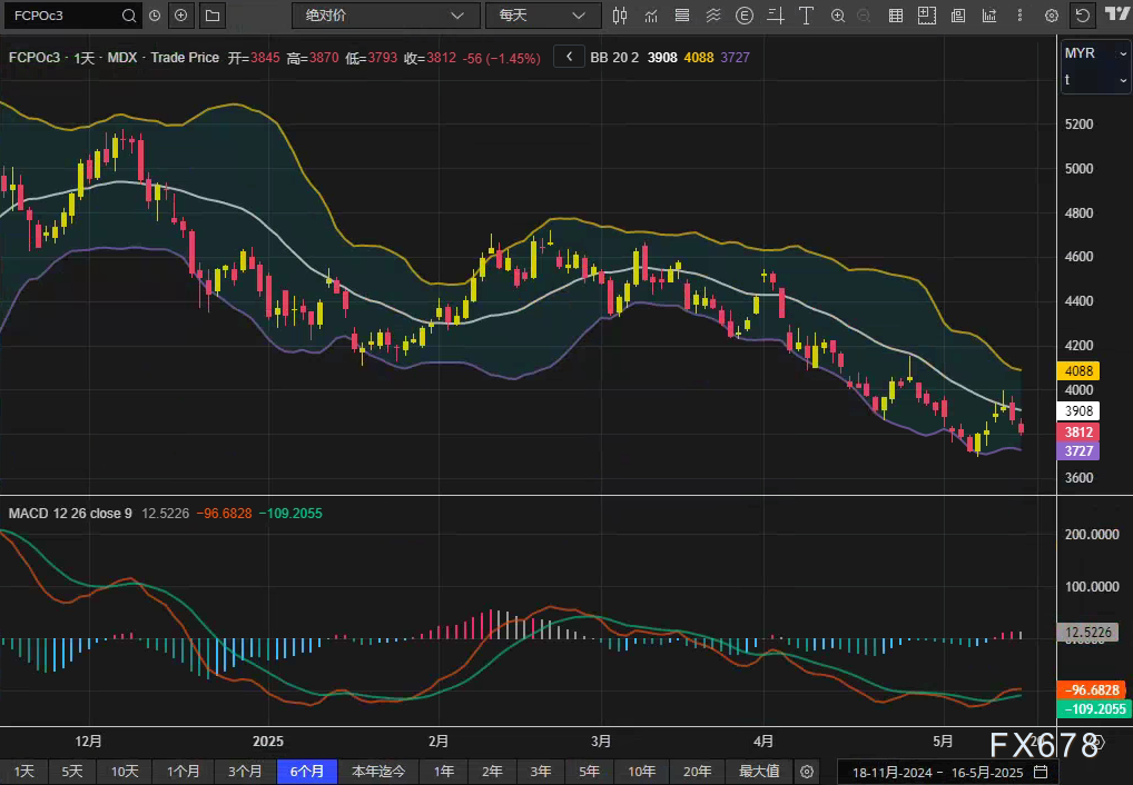 周五 5月16日 马来西亚衍生品交易所 BMD 棕榈油主力合约 FCPOc3 收于3812林吉特 吨 单日下跌1 14 周线微跌0 05 连续第三周收阴 尽管本周跌幅为去年9月以来最小 但技术面仍显疲态 日线布林通道 202 中轨 ...