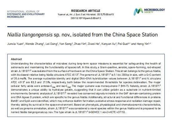 近日,科研人员首次公布在我国空间站发现的一个微生物新物种,并将其命名为“天宫尼尔菌(Niallia tiangongensis)”,相关科研成果在线发表于国际权威期刊《International Journal of Systematic and Evolution ...