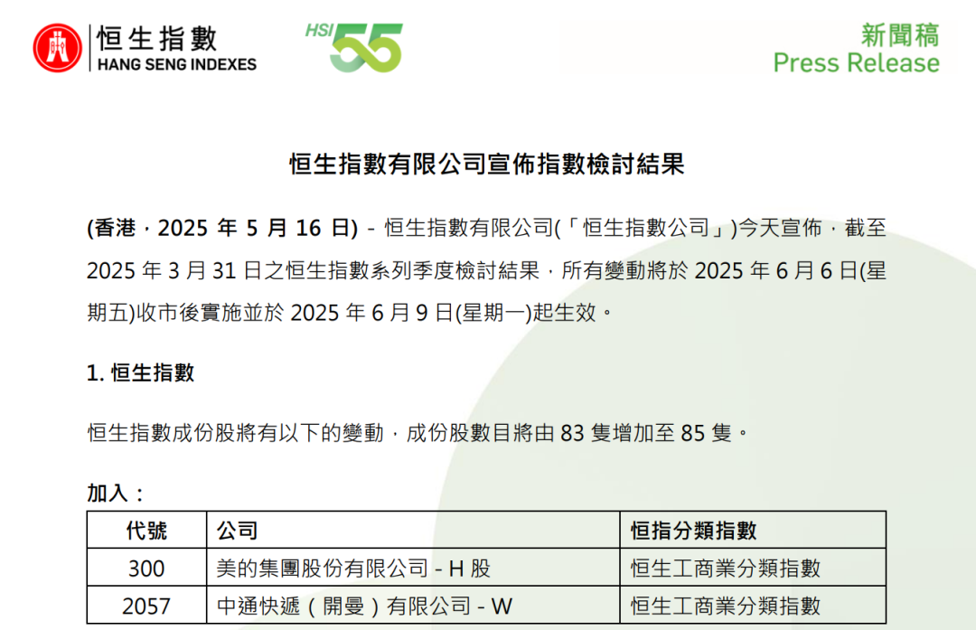 【导读】恒指季检结果公布!比亚迪股份将纳入恒生科技指数 5月16日,恒生指数公司公布季检结果,恒生指数成份股数目将由83只增加至85只,调入美的集团、中通快递;恒生科技指数调入比亚迪股份,剔除阅文集团。 比亚迪股份将纳入恒生科技指数 阅文集团被剔除 5月16日,恒生指数公司在官网公布了截至2025年3月31日的恒生指数系列检讨结果,所有调整将于2025年6月6日(星期五)收市后实施,并于2025年6月9日(星期一)起生效。 ![]() 具体来看,恒生指数调入美的集团、中通快递,成份股数量将由83只增加至85只。 恒生中国企业指数没有变动,成份股数量仍为50只。 恒生科技指数调入比亚迪股份,剔除阅文集团,成份股数量仍为30只。 ![]() 恒生生物科技指数调入同源康医、康基医疗,剔除康宁杰瑞制药-B、荣昌生物,成份股数量维持50只。 恒生综合指数将纳入布鲁可、古茗以及蜜雪集团,成份股总数将由502只增加至505只。 ![]() 据悉,恒生指数公司负责编制及管理恒生指数系列,主要涵盖在香港与中国内地上市的股票,其中包括恒生指数、恒生中国企业指数、恒生科技指数,以及沪深港通、大湾区、可持续发展与各类型行业指数等。截至2025年3月底,被动式追踪恒生指数系列的产品资产管理总值约为882亿美元。 港股有望迎来正面催化 2025年以来,港股市场先后经历经济预期下行、DeepSeek技术突破引发的中国科技核心资产价值重估、中美贸易摩擦冲击过后的企稳回升。 4月8日以来,恒生科技指数已累计上涨20%。 交银国际表示,港股多数行业价格与估值全面修复,内需与防御板块领跑,盈利预期稳健。从港股行业表现来看,多数行业的价格和估值水平已较4月初“对等关税”宣布时完全修复。信息技术和半导体等前期引领科技结构性行情的景气成长板块,尽管此前经历了较大幅度回调,但目前已接近全面修复。而内需驱动型的家电、运动鞋服、食品饮料等消费板块,以及公用事业、原材料等高股息防御性板块,已突破前期高点。企业盈利预期整体受关税政策影响相对有限,少数周期性板块出现小幅下修,绝大多数行业的盈利预期保持平稳。 内外形势迎来积极改善,港股有望迎来正面催化。中美首次谈判成果超预期,短期内风险情绪趋于平稳。基本面方面,中国出口韧性持续,内需政策组合加速推进,包括央行降准降息、消费刺激、房地产支持和政府债发行提速等多层次政策体系,企业盈利预期有望回归中性偏积极。 展望2025年下半年,开源证券海外市场团队认为,短期政策博弈型品种波动率仍在,中期仍需关注关税政策对中国经济基本面的潜在压力,这一压力可能制约港股市场继续显著回升的空间。在震荡市中,需重点聚焦中国经济转型的主线方向。
