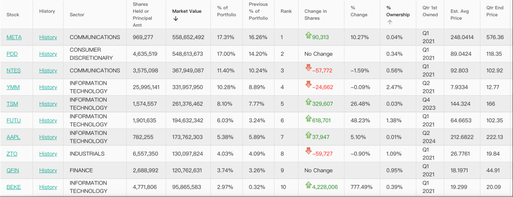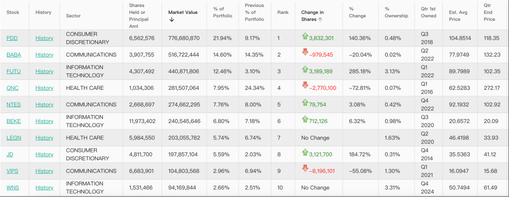 两家国内资管巨头的美股持仓曝光。 近日,13F文件显示,高瓴旗下HHLR Advisors一季度新进和增持了近20只股票,持仓总市值从上季度末28.87亿美元增至35.39亿美元,增幅近23%,新进买入百度、理想等多家中概股公司。 此外,景林资产的海外子公司景林资产管理香港有限公司提交的美股持仓数据显示,截至今年一季度末,其持仓总市值为32.28亿美元,较去年底有所增加,一季度新进中概股阿里巴巴、禾赛科技。 根据美国证券交易委员会(SEC)规定,管理资产规模超过1亿美元的基金经理,必须在每个季度结束后的45天内,公布一份名为“13F表格”的文件,以披露股票、债券方面的持仓。 HHLR大幅加仓中概股 HHLR Advisors是高瓴投资美股的对冲基金,由二级市场投资团队负责管理和运营。 13F文件显示,截至今年一季度末,HHLR Advisors持仓总市值从上季度末的28.87亿美元增至35.39亿美元,增幅近23%。 13F数据平台Whalewisdom统计显示,HHLR Advisors总共增持8只股票、减持10只股票、新进11只股票、清仓7只股票。 其前十大持仓为拼多多、阿里巴巴、富途控股、百济神州、网易、贝壳、传奇生物、京东、唯品会和WNS HLDGS LTD,中概股占到9席,该基金今年一季度前十大持仓标的占比88.46%。 ![]() 其中,京东为新进出现在前十大持仓的个股,截至今年一季度末,HHLR Advisors持有京东481.17万股,相比于去年末大幅增持312.17万股,增持比例达184.72%。 值得一提的是,HHLR Advisors一季度新进和增持的都是中概股,新进买入了亚朵集团、华住集团、百度、玉柴国际、理想汽车、Boss直聘、亿咖通科技等10家公司,同时还增持了包括京东在内的8家公司,分别为富途控股、拼多多、网易、贝壳、京东、携程和中通快递。 减持方面,高瓴减持阿里巴巴97.95万股,较上季度持股数减少了20.04%,截至今年一季度末市值超5.17亿美元,维持在高瓴第二大重仓股的位置。 景林加仓台积电、清仓英伟达 截至今年一季度末,景林资产今年一季度新买进3只股票,加仓11只股票;清仓了8只股票,并对13只持仓股票进行了不同程度的减持。 景林资产美股持仓的前十大重仓股分别为脸书母公司Meta、拼多多、网易、满帮集团、台积电、富途控股、苹果、中通快递、奇富科技、贝壳,合计持股市值为27.84亿美元,占其美股持仓总市值的86.24%左右,中概股依旧占主导。 ![]() 其中,脸书母公司Meta已经被景林资产连续两个季度加仓,今年一季度增持约9万股,持股数量增至96.93万股,季末持仓市值为5.59亿美元,占组合比例的17.31%,仍为第一大持仓。 前十大重仓股中,景林资产还加仓台积电32.96万股,期末持股增至157.46万股,持股市值为2.61亿美元;加仓富途控股61.87万股,持股增至190.16万股,期末持仓市值为1.95亿美元;小幅增持科技巨头苹果,持股增至78.23万股,期末持有市值为1.74亿美元;加仓贝壳422.80万股,增持幅度超过777%,持股达到477.18万股,一季度末持有市值为9586.56万美元。 新进个股方面,今年一季度,景林资产新进阿里巴巴、英特尔和禾赛科技。景林资产新进持有禾赛科技74.86万股,持股市值为1107.86万美元;新进持有阿里巴巴60.11万股,季末持仓市值为7948.90万美元;新进持有英特尔218万股,期末持有市值为4950.77万美元。 值得注意的是,景林资产在今年一季度清仓了AI算力龙头英伟达,卖掉了3.78万股,结束了自2023年第一季度以来长达多个季度的持有。此外,景林资产还清仓了VISA、亚马逊,清仓股数分别为11.5万股、3.2万股。 减持方面,景林香港公司在今年一季度卖掉了谷歌45.53万股,持股仅剩4.60万股,减持幅度达到91%左右;还卖掉微软近84%的仓位,减持14.93万股,持股降至2.87万股。 (文章来源:澎湃新闻) |