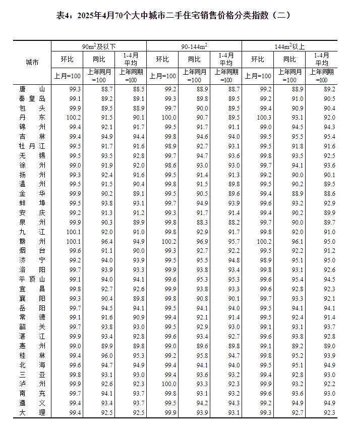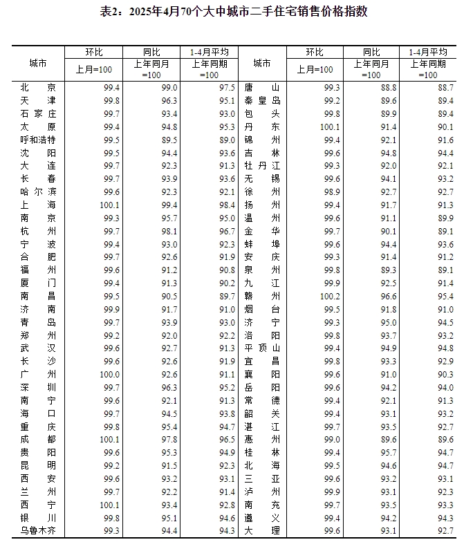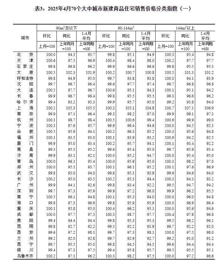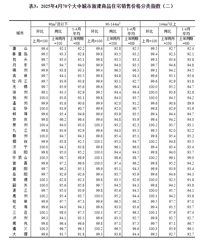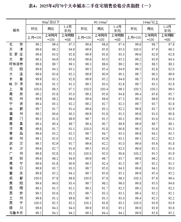 2025年4月份,70个大中城市中,各线城市商品住宅销售价格环比持平或略降,同比降幅均持续收窄。 一、各线城市商品住宅销售价格环比持平或略降 4月份,一线城市新建商品住宅销售价格环比由上月上涨0.1%转为持平。其中,北京和上海分别上涨0.1%和0.5%,广州和深圳分别下降0.2%和0.1%。二线城市新建商品住宅销售价格环比持平,与上月相同。三线城市新建商品住宅销售价格环比下降0.2%,降幅与上月相同。 4月份,一线城市二手住宅销售价格环比由上月上涨0.2%转为下降0.2%。其中上海上涨0.1%,广州持平,北京和深圳分别下降0.6%和0.3%。二、三线城市二手住宅销售价格环比均下降0.4%,降幅比上月分别扩大0.2个和0.1个百分点。 二、各线城市商品住宅销售价格同比降幅均持续收窄 4月份,一线城市新建商品住宅销售价格同比下降2.1%,降幅比上月收窄0.7个百分点。其中,上海上涨5.9%,北京、广州和深圳分别下降5.0%、6.3%和3.0%。二、三线城市新建商品住宅销售价格同比分别下降3.9%和5.4%,降幅分别收窄0.5个和0.3个百分点。 4月份,一线城市二手住宅销售价格同比下降3.2%,降幅比上月收窄0.9个百分点。其中,北京、上海、广州和深圳分别下降1.0%、0.6%、7.4%和3.7%。二、三线城市二手住宅销售价格同比分别下降6.5%和7.4%,降幅分别收窄0.5个和0.4个百分点。 注释: 70个大中城市房地产价格统计一二三线城市划分:一线城市指北京、上海、广州、深圳等4个城市;二线城市指天津、石家庄、太原、呼和浩特、沈阳、大连、长春、哈尔滨、南京、杭州、宁波、合肥、福州、厦门、南昌、济南、青岛、郑州、武汉、长沙、南宁、海口、重庆、成都、贵阳、昆明、西安、兰州、西宁、银川、乌鲁木齐等31个城市;三线城市指唐山、秦皇岛、包头、丹东、锦州、吉林、牡丹江、无锡、徐州、扬州、温州、金华、蚌埠、安庆、泉州、九江、赣州、烟台、济宁、洛阳、平顶山、宜昌、襄阳、岳阳、常德、韶关、湛江、惠州、桂林、北海、三亚、泸州、南充、遵义、大理等35个城市。 2025年4月份70个大中城市商品住宅销售价格变动情况 ![]() ![]() ![]() ![]() ![]() ![]() 附注: 1.调查范围:各城市的市辖区,不包括县。 2.调查方法:新建商品住宅销售价格调查为全面调查,基础数据采用当地房地产管理部门的网签数据;二手住宅销售价格调查为重点调查和典型调查相结合,基础数据来源于房地产经纪机构或房屋居住服务平台等相关企业上报和调查员实地采价。 3.价格指数的计算方法详见《房地产价格统计报表制度》。 4.如某城市当月无成交,则视为价格水平总体无变动。 (文章来源:国家统计局) |