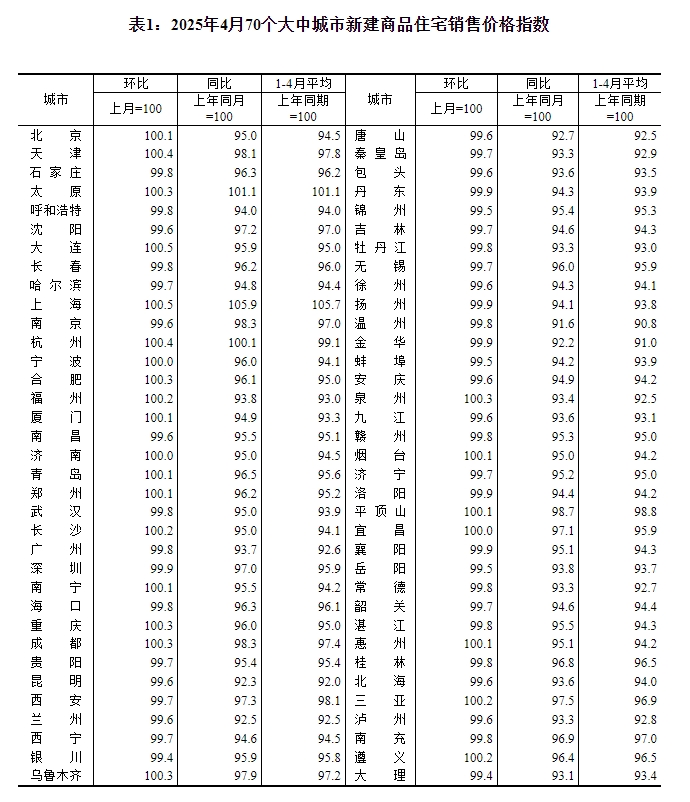 2025年4月份,70个大中城市中,各线城市商品住宅销售价格环比持平或略降,同比降幅均持续收窄。 一、各线城市商品住宅销售价格环比持平或略降 4月份,一线城市新建商品住宅销售价格环比由上月上涨0.1%转为 ...