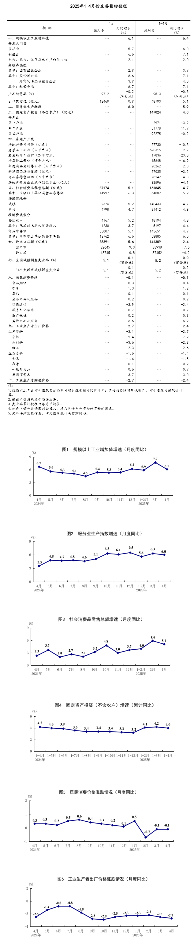 ![]() 国家统计局5月19日发布数据显示,4月份,全国规模以上工业增加值同比增长6.1%,全国服务业生产指数同比增长6.0%,社会消费品零售总额同比增长5.1%;1至4月份,全国固定资产投资(不含农户)同比增长4.0%,社会消费品零售总额161845亿元,同比增长4.7%,货物进出口总额同比增长2.4%,国民经济顶住压力稳定增长,延续向新向好发展态势。 4月份国民经济顶住压力稳定增长 (2025年5月19日) 国家统计局 4月份,面对外部冲击影响加大、内部困难挑战叠加的复杂局面,在以习近平同志为核心的党中央坚强领导下,各地区各部门认真贯彻落实党中央、国务院决策部署,坚持稳中求进工作总基调,完整准确全面贯彻新发展理念,加快构建新发展格局,扎实推动高质量发展,加紧实施更加积极有为的宏观政策,有力有效应对外部冲击,生产需求平稳增长,就业形势总体稳定,新动能积聚成长,国民经济顶住压力稳定增长,延续向新向好发展态势。 一、工业生产较快增长,装备制造业和高技术制造业增势较好 4月份,全国规模以上工业增加值同比增长6.1%,环比增长0.22%。分三大门类看,采矿业增加值同比增长5.7%,制造业增长6.6%,电力、热力、燃气及水生产和供应业增长2.1%。装备制造业增加值同比增长9.8%,高技术制造业增加值增长10.0%,分别快于全部规模以上工业增加值3.7和3.9个百分点。分经济类型看,国有控股企业增加值同比增长2.9%;股份制企业增长6.6%,外商及港澳台投资企业增长3.9%;私营企业增长6.7%。分产品看,3D打印设备、工业机器人、新能源汽车产品产量同比分别增长60.7%、51.5%、38.9%。1-4月份,全国规模以上工业增加值同比增长6.4%。4月份,制造业采购经理指数为49.0%,企业生产经营活动预期指数为52.1%。1-3月份,全国规模以上工业企业实现利润总额15094亿元,同比增长0.8%。 二、服务业平稳增长,现代服务业发展较好 4月份,全国服务业生产指数同比增长6.0%。分行业看,信息传输、软件和信息技术服务业,租赁和商务服务业,批发和零售业,金融业生产指数同比分别增长10.4%、8.9%、6.8%、6.1%,分别快于服务业生产指数4.4、2.9、0.8、0.1个百分点。1-4月份,全国服务业生产指数同比增长5.9%。1-3月份,规模以上服务业企业营业收入同比增长7.0%。4月份,服务业商务活动指数为50.1%,服务业业务活动预期指数为56.4%。其中,航空运输、电信广播电视及卫星传输服务、互联网软件及信息技术服务、保险等行业商务活动指数位于55.0%以上较高景气区间。 三、市场销售稳定增长,以旧换新相关商品增长较快 4月份,社会消费品零售总额37174亿元,同比增长5.1%;环比增长0.24%。按经营单位所在地分,城镇消费品零售额32376亿元,同比增长5.2%;乡村消费品零售额4798亿元,增长4.7%。按消费类型分,商品零售额33007亿元,增长5.1%;餐饮收入4167亿元,增长5.2%。基本生活类和部分升级类商品销售增势较好,限额以上单位粮油食品类、体育娱乐用品类商品零售额分别增长14.0%、23.3%。消费品以旧换新政策持续显效,限额以上单位家用电器和音像器材类、文化办公用品类、家具类、通讯器材类商品零售额分别增长38.8%、33.5%、26.9%、19.9%。1-4月份,社会消费品零售总额161845亿元,同比增长4.7%。全国网上零售额47419亿元,同比增长7.7%。其中,实物商品网上零售额39265亿元,增长5.8%,占社会消费品零售总额的比重为24.3%。1-4月份,服务零售额同比增长5.1%。 四、固定资产投资持续扩大,制造业投资增长较快 1-4月份,全国固定资产投资(不含农户)147024亿元,同比增长4.0%;扣除房地产开发投资,全国固定资产投资增长8.0%。分领域看,基础设施投资同比增长5.8%,制造业投资增长8.8%,房地产开发投资下降10.3%。全国新建商品房销售面积28262万平方米,同比下降2.8%;新建商品房销售额27035亿元,下降3.2%。分产业看,第一产业投资同比增长13.2%,第二产业投资增长11.7%,第三产业投资下降0.2%。民间投资同比增长0.2%;扣除房地产开发投资,民间投资增长5.8%。高技术产业中,信息服务业,计算机及办公设备制造业,航空、航天器及设备制造业,专业技术服务业投资同比分别增长40.6%、28.9%、23.9%、17.6%。4月份,固定资产投资(不含农户)环比增长0.10%。 五、货物进出口持续增长,贸易结构继续优化 4月份,货物进出口总额38391亿元,同比增长5.6%。其中,出口22645亿元,增长9.3%;进口15745亿元,增长0.8%。1-4月份,货物进出口总额141389亿元,同比增长2.4%。其中,出口83938亿元,增长7.5%;进口57452亿元,下降4.2%。1-4月份,一般贸易进出口增长0.6%,占进出口总额的比重为64.0%。民营企业进出口增长6.8%,占进出口总额的比重为56.9%,比上年同期提高2.3个百分点。机电产品出口增长9.5%,占出口总额的比重为60.1%。 六、就业形势总体稳定,城镇调查失业率下降 1-4月份,全国城镇调查失业率平均值为5.2%,与上年同期持平。4月份,全国城镇调查失业率为5.1%,比上月下降0.1个百分点。本地户籍劳动力调查失业率为5.2%;外来户籍劳动力调查失业率为4.8%,其中外来农业户籍劳动力调查失业率为4.7%。31个大城市城镇调查失业率为5.1%,比上月下降0.1个百分点。全国企业就业人员周平均工作时间为48.3小时。 七、居民消费价格同比略降,核心CPI涨幅稳定 4月份,全国居民消费价格(CPI)同比下降0.1%,环比上涨0.1%。分类别看,食品烟酒价格同比上涨0.3%,衣着价格上涨1.3%,居住价格上涨0.1%,生活用品及服务价格上涨0.2%,交通通信价格下降3.9%,教育