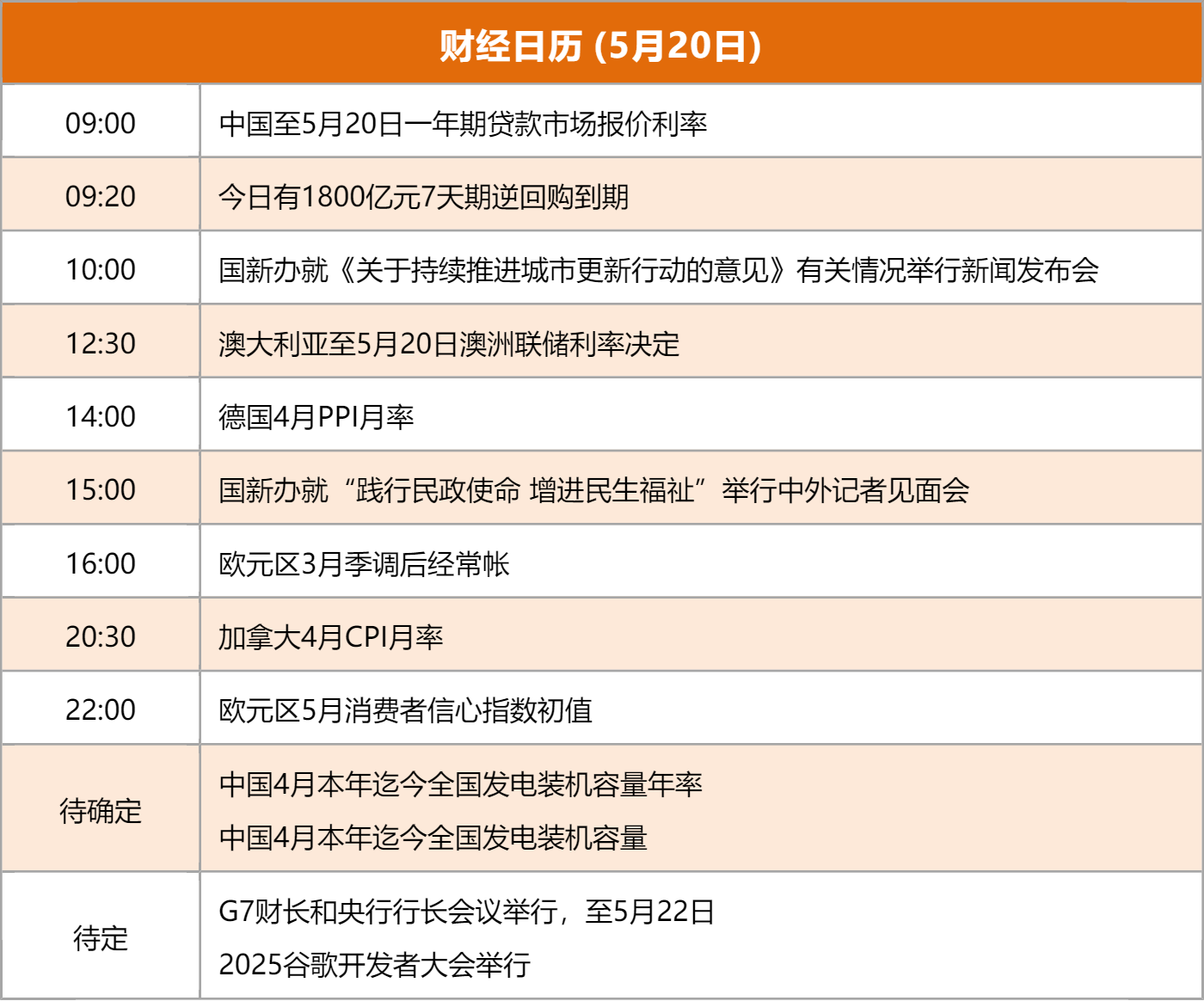 ![]() ![]() 1、财联社:新一轮存款利率下调来临。中国建设银行、招商银行于5月20日下调了人民币存款利率。其中活期利率下调5个基点至0.05%;定期整存整取三个月期、半年期、一年期、二年期均下调15个基点,分别为0.65%、0.85%、0.95%、1.05%;三年期和五年期均下调25个基点,分别至1.25%和1.3%。定期零存整取、整存零取、存本取息三种期限均下调15个基点。7天期通知存款利率下调15个基点至0.3%。 2、商务部:美国商务部网站调整了其5月12日发布的AI芯片出口管制指南新闻稿相关表述,将“在世界任何地方使用华为昇腾芯片均违反美国出口管制法规”调整为“警告业界使用中国先进计算机芯片,包括特定华为昇腾芯片的风险”。对此,商务部发言人表示,中方注意到,近日美方对指南新闻稿相关表述进行了调整,但指南本身的歧视性措施和扭曲市场本质并没有改变。中方敦促美方立即纠正错误做法,停止对华歧视性措施。倘若美方一意孤行,继续实质性损害中方利益,中方必将采取坚决措施,维护自身正当权益。 3、财联社:深交所主办的2025全球投资者大会在深圳举行。来自监管的声音引发市场广泛关注,证监会副主席李明“喊话”全球投资者,A股估值仍处于相对低位,中国资本市场开放的步伐将始终坚定。多家外资机构首席经济学家、专家学者们传递出强烈的信号,即在一揽子金融支持经济发展政策之下,中美贸易谈判进展超预期,全球投资者的目标再次转向中国资产。 4、国家外汇管理局:日前,国家外汇管理局公布了2025年4月银行结售汇和银行代客涉外收付款数据。国家外汇管理局副局长、新闻发言人李斌就2025年4月外汇收支形势回答了记者提问。他表示,外资配置人民币资产意愿持续向好。4月外资净增持境内债券109亿美元,处于较高水平。4月下旬外资投资境内股票转为净买入。 5、央视网:5月19日,首次应用华为鸿蒙操作系统的个人电脑正式发布,这也是我国首款从操作系统内核完全自主研发的个人电脑。预计到今年年底,将支持超过2000个以上的融合应用。鸿蒙电脑的诞生意味着“国产芯+国产系统”实现了软硬件自主可控。 央视新闻:总台记者获悉,当地时间19日,美国总统特朗普和俄罗斯总统普京的通话结束,共持续2个多小时。普京在通话结束后发表声明表示,通话超过两个小时,内容非常充实和开放。普京称,通话是非常有益的、有建设性的。俄罗斯赞成和平解决乌克兰危机,但是应该确定更有效的通向和平的道路。普京表示,伊斯坦布尔谈判的恢复表明整体上在沿着正确的道路行进。 国家统计局:4月份,全国规模以上工业增加值同比增长6.1%,全国服务业生产指数同比增长6.0%,社会消费品零售总额同比增长5.1%;1至4月份,全国固定资产投资(不含农户)同比增长4.0%,社会消费品零售总额161845亿元,同比增长4.7%,货物进出口总额同比增长2.4%,国民经济顶住压力稳定增长,延续向新向好发展态势。 界面新闻:日前,经国务院同意,工信部等九部门联合印发《关于加快推进科技服务业高质量发展的实施意见》,以创新驱动、市场导向、融合发展、系统推进、质量为先为原则,壮大服务主体,优化发展生态,提升服务能力,实现规模增长和质效提升,加快科技成果转化和产业化,有力支撑科技创新和产业创新融合发展。 央视网:近日,全国总工会、最高人民法院、最高人民检察院等七部门印发文件,将联合建立完善信息共享、联合调研、典型案例发布等制度,推动与劳动者权益密切相关的法律法规及政策文件的制定修改。推动平台企业与新就业形态劳动者开展常态化协商,健全劳动者权益协商协调机制。 央视网:中国进出口银行发布的数据显示,1—4月投放制造业中长期贷款超1800亿元。4月末,制造业中长期贷款余额达1.8万亿元,重点支持了船舶、工程机械等制造业产品出口,积极满足科技型企业全周期金融需求,全力支持现代化产业体系建设。 澎湃新闻:有记者就中国最高贸易谈判代表与美国贸易代表格里尔进行会谈一事提问。对此,外交部发言人表示,已经多次阐明了中方在关税和贸易问题上的立场。具体问题建议向中方的主管部门了解。 证券时报网:欧盟委员会下调今明两年经济增长预期,预计欧元区GDP今年仅增长0.9%,低于去年11月预期的1.3%;预计2026年欧元区GDP增长1.4%,低于此前预测的1.6%。欧元区增长前景被显著下调,主要是受关税上调、近期美国贸易政策突变和关税最终配置的不确定性加剧等因素的影响。 央视网:国家卫生健康委等单位近日启动了全国托育服务质量提升三年行动,围绕机构管理、规范服务、医育结合等多个方面明确规范,提升托育服务的安全性、规范性和科学性,建立跨部门综合监管机制。到2027年底,我国托育服务规范化水平将显著提升。 央视网:据中国卫星导航定位协会,2024年我国以北斗为核心的卫星导航与位置服务产业总体产值达到5758亿元人民币,同比增长7.39%,产业规模持续扩大。同时,北斗进入规模化应用新阶段,全面融入电力、通信、交通运输等国家重要基础设施建设,以及大众消费、共享经济等多个领域。最新数据显示,2024年国内卫星导航定位终端产品总销量超过4.1亿台,其中具有卫星导航定位功能的智能手机出货量达到2.94亿台。 界面新闻:国家发改委发布消息称,自5月19日24时起,国内汽油价格和柴油价格分别下调230元/吨和220元/吨。折合升价