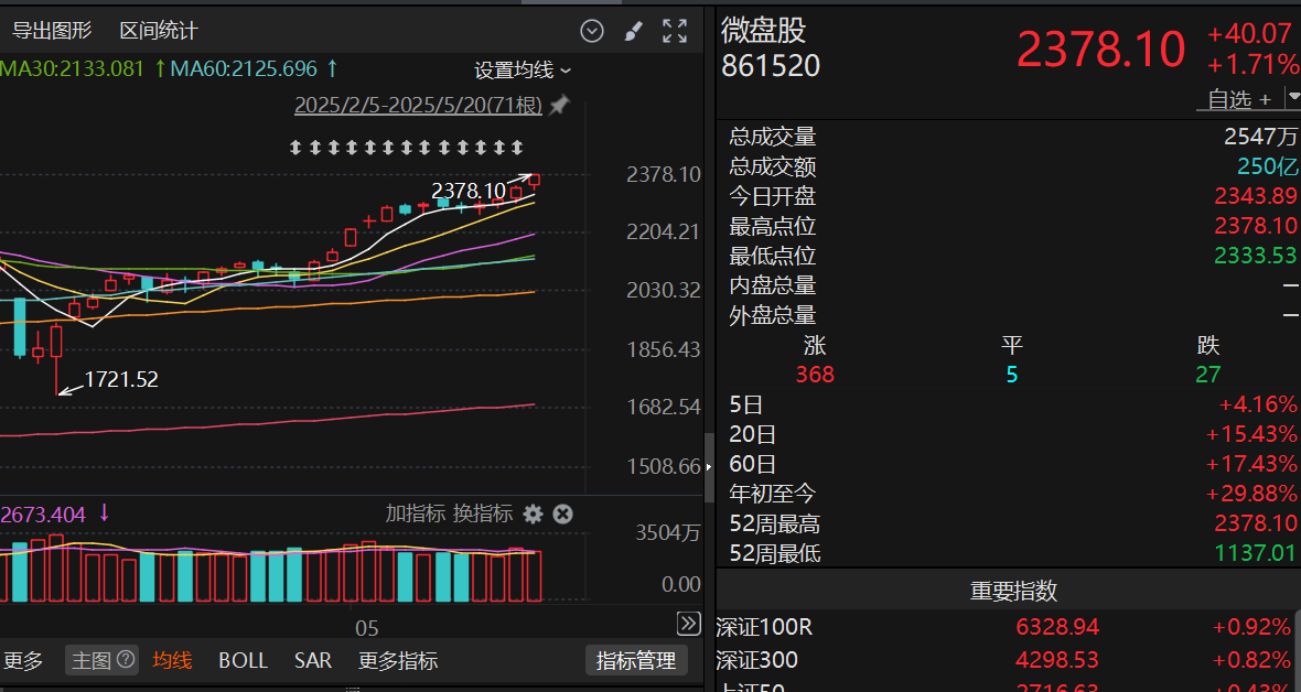 在纠结方向选择数日后,A股市场终于选择放量向上。 5月20日,三大指数集体收涨,沪指涨0.38%,收报3380.48点;深证成指涨0.77%,收报10249.17点;创业板指涨0.77%,收报2048.46点。 沪深京三市成交额超1.2万亿元,较昨日放量近千亿元。 个股方面,超过3800只个股上涨。生物制品、游戏、包装材料、食品饮料、文化传媒板块涨幅居前,航运港口板块逆势下跌。 ![]() 5月20日,多家银行宣布降息,一年期定期存款利率已跌破了1%关口。 降息周期中,投资股票、基金等资产有望获取比低息存款更高收益,企业融资成本降低也利于提升盈利,使得资本市场吸引力进一步提升。 在本周深交所主办的2025全球投资者大会上,证监会副主席李明表示,A股估值仍处于相对低位。投资中国意味着更高的确定性。今年以来,社保、保险、年金等中长期资金累计净买入A股超过2000亿元,反映出中长期资金加速流入与股市稳中有涨的良性循环正在形成。 三大指数蓄势多日后选择放量上涨,说明市场人气在回升,有利于吸引更多观望的投资者入场。 值得注意的是,今日北证50(899050)、微盘股指数(861520)双双创出历史新高。北证50指数涨1.22%,收报1473.99点;微盘股指数报收于2378.10点,涨幅为1.71%。 年初至今,北证50上涨超40%,微盘股指数上涨近30%。 ![]() 相关基金在今年收益颇丰。数据显示,今年以来,已有北交所基金的收益超过70%,还有多只绩优北交所产品的年内收益超过45%。 与微盘股挂钩的多只中证2000指数ETF也走势不凡,如中证2000指数ETF(159536)本月以来涨幅达到6%。 ![]() 北证50和微盘股双双上涨与并购重组新规有关。上周五,证监会发布《关于修改<上市公司重大资产重组管理办法> 的决定》,在简化审核程序、创新交易工具、提升监管包容度等方面作出系列安排。北交所也发布了相关落地规则,引入了“小额快速”审核机制和重组简易审核程序,并对股份对价分期支付机制进行了细化明确,丰富了创新型中小企业的并购重组工具储备。 此外,新规还为中小成长企业提供了更大的财务弹性,有助于避免一次性支付压力过大而影响项目推进,降低了交易风险,提升了交易的灵活度,使中小成长公司有更多机会参与并购大体量标的资产,实现规模扩张。 因此,资金更青睐于偏成长与弹性,且有更多并购重组想象空间的微小盘股也不足为奇了。 不过,在近期不少中小盘、微盘股涨幅较大的背景下,有分析师建议投资者保持更均衡的资产配置风格,以规避风险。 东吴证券在最新研报中指出,当前,A股已进入外部扰动阶段性平息阶段,下有支撑、上待催化,预计短期走势偏震荡。中美日内瓦会谈后,关税贸易风险暂缓,指数已回补此前缺口并重回关税冲击前水平。短期缺乏有力催化推动A股进一步上攻,但向下亦有支撑,预计指数走势将以震荡为主。 风格上,东吴证券建议采取“大市值+科技成长”的杠铃策略,一端配置偏大市值的宽基/策略指数,另一端继续关注科技成长。预计未来一个月内,弹性机会大概率将围绕科技成长领域中自主可控、AI、机器人等方向展开轮动。因此,在行业/主题ETF配置上,建议重点关注自主可控与产业趋势两大方向。 值得一提的是,某些高位抱团股在今日显示出了退潮迹象。军工板块中,利君股份跌停;航运板块中前期大热的宁波远洋跌停,宁波海运跌超8%。 还是那句话,保持乐观的同时,不盲目追高是重要的投资纪律。 ![]() 最后我们再来看看今日市场另外两则关于港股市场的新闻。 宁德时代H股今日在港交所挂牌上市。本次“宁王”IPO,全球发售股份总数为“绿鞋”(指超额配售选择权)前1.35亿股,发行价格为每股263港元。上市开盘即高开,开盘价每股296港元,较发行价上涨12.55%。 宁德时代A股今日也走强,收盘报于每股263元人民币,涨幅为1.15%。 小米今天也有大新闻。昨日,雷军在社交平台上表示,小米自主研发设计的3nm制程手机处理器芯片玄戒O1即将亮相,该消息引发热议。今日,雷军再次透露,玄戒O1已开始大规模量产。据其所述,小米玄戒O1采用第二代3nm工艺制程,力争跻身“第一梯队旗舰体验”。 天风证券发布研报表示,预计小米发布自研芯片后,国产手机高端竞争格局或开始加速变化,头部具备自研底层硬件能力的手机厂商市占率提升或是小米估值提升的核心逻辑之一。目前来看小米在手机、OS、芯片层面的多年自研和投入已逐渐开始兑现,此外手机、OS、芯片的协同效应正在汽车业务持续发展下推动,例如自研芯片或在手机以外的产品端使用,系统的优化规模效应或跨平台体现。预计小米2025-2026年经调整归母净利润分别为429亿元和855亿元人民币,维持对公司的买入评级。 受此利好消息拉动,小米集团-W股价大涨,截至发稿,涨幅已超过4%。 ![]() (文章来源:每日经济新闻) |