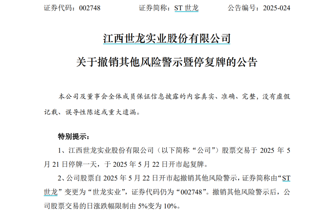 5月20日晚间,ST世龙发布公告称,公司股票自5月22日开市起撤销其他风险警示,证券简称由“ST世龙”变更为“世龙实业”,证券代码仍为“002748”。撤销其他风险警示后,公司股票交易的日涨跌幅限制由5%变为10%。 ST世龙股票将于5月21日停牌一天,5月22日开市起复牌。 ![]() 根据公告披露,2024年3月12日,ST世龙收到中国证监会江西监管局(以下简称江西证监局)出具的《行政处罚事先告知书》。2019年至2020年期间,世龙实业全资子公司江西世龙供应链管理有限公司通过与相关客户开展无实物流转、不具有商业实质的虚假贸易业务,虚增营业收入、营业成本和利润,导致公司2019年年度报告和2020年年度报告存在虚假记载。 2024年5月15日,ST世龙收到江西证监局下发的《行政处罚决定书》〔2024〕1号。根据相关规定,公司股票自2024年5月17日起被实施“其他风险警示”,股票简称由“世龙实业”变更为“ST世龙”。 针对上述情况,ST世龙已就行政处罚决定所涉事项对相应年度财务会计报告进行追溯重述,且已出具标准无保留意见的审计报告。另外,自中国证监会作出行政处罚决定书之日起已满十二个月期限。 ST世龙表示,根据相关规定,公司符合申请撤销其他风险警示的条件,且公司不存在其他需要实施其他风险警示或退市风险警示的情形。公司关于撤销其他风险警示的申请已获得深圳证券交易所审核同意。 公开资料显示,ST世龙是以氯碱及下游产品为主的综合性化工企业,主要从事AC发泡剂、氯化亚砜、氯碱、水合肼及双氧水等化工产品的研发、生产和销售。 业绩方面,ST世龙2025年一季报显示,公司实现营业收入5.07亿元,同比增长8.32%;归母净利润为2417.41万元,同比增长342.56%。 ![]() 截至5月20日收盘,ST世龙报9.18元/股,总市值为22亿元。 ![]() (文章来源:中国基金报) |