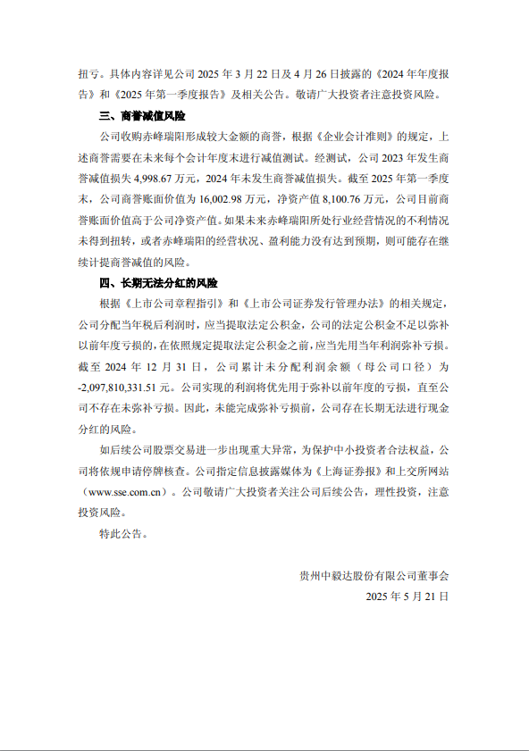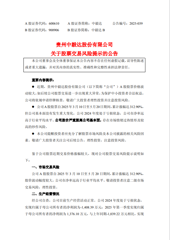 中毅达发布股票交易风险提示公告称,近期,公司A股股票价格波动较大,如后续公司股票交易进一步出现重大异常,为保护中小投资者合法权益,公司将依规申请停牌核查。公司A股股票自2025年3月10日至5月20日期间,累计涨幅达312.90%,但公司基本面没有发生重大变化,公司2024年度处于亏损状态,公司市净率远高于行业平均水平。公司股价严重脱离公司基本面,存在市场情绪过热情形及较高的炒作风险。 ![]() ![]() (文章来源:第一财经) |