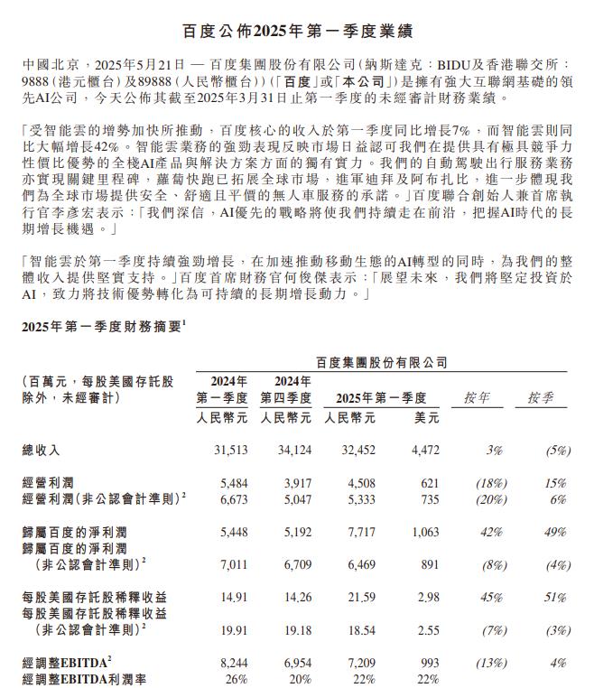 百度2025年第一季度营收324.52亿元,同比增3%,上年同期315.13亿元;调整后营业利润53.3亿元,预估48.9亿元。调整后EBITDA为72亿元人民币(9.93亿美元),调整后EBITDA利润率为22%。百度核心的调整后EBITDA为67 ...