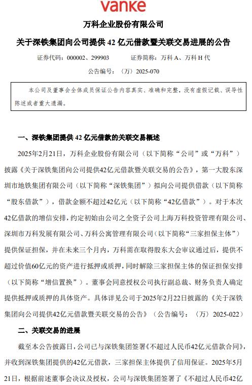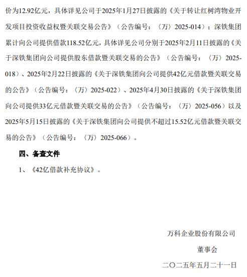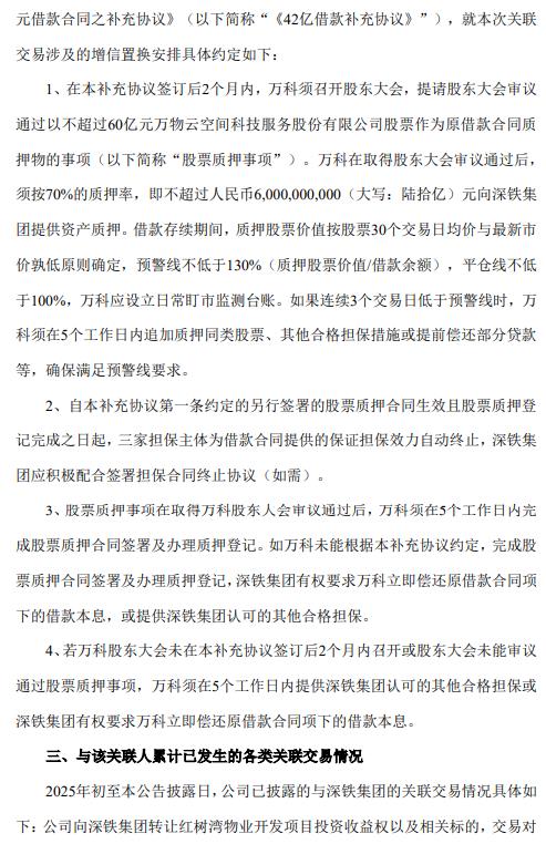 万科A(000002.SZ)公告称,已与深圳地铁集团签署《不超过人民币42亿元借款合同》,并收到42亿元借款。同时,公司与深铁集团签署了《42亿借款补充协议》,约定以不超过60亿元万物云股票作为原借款合同质押物,并提 ...